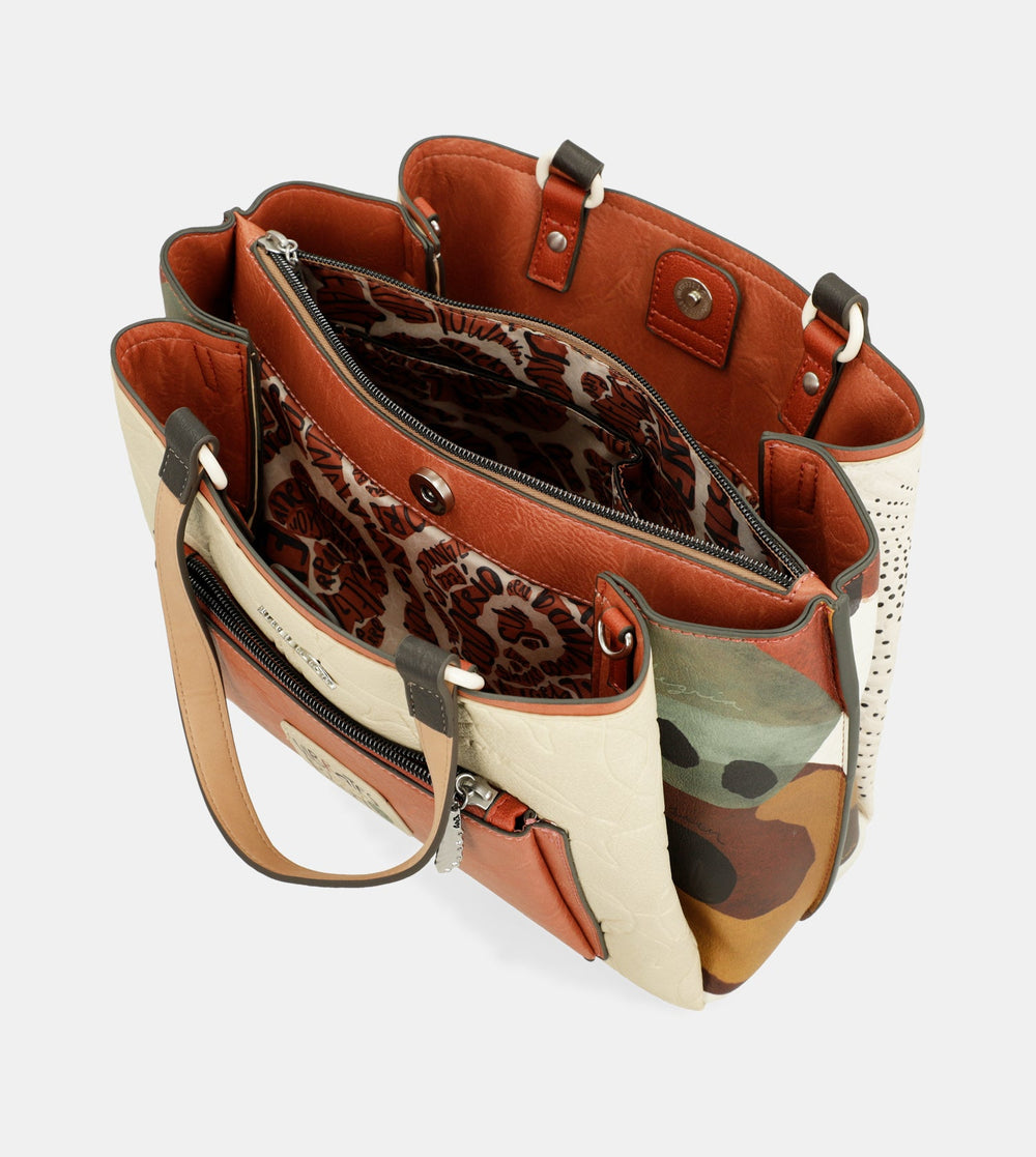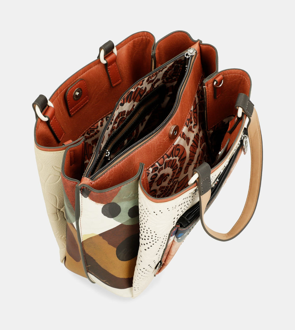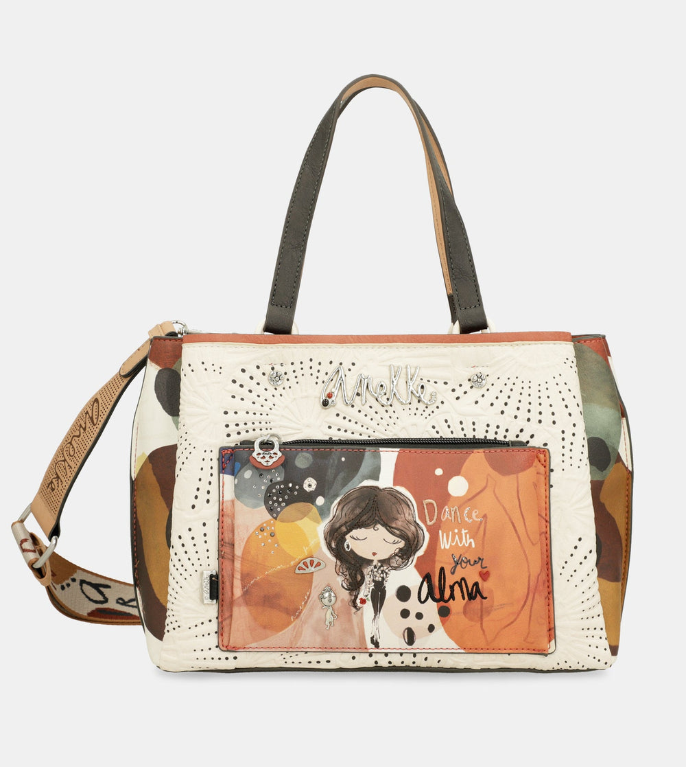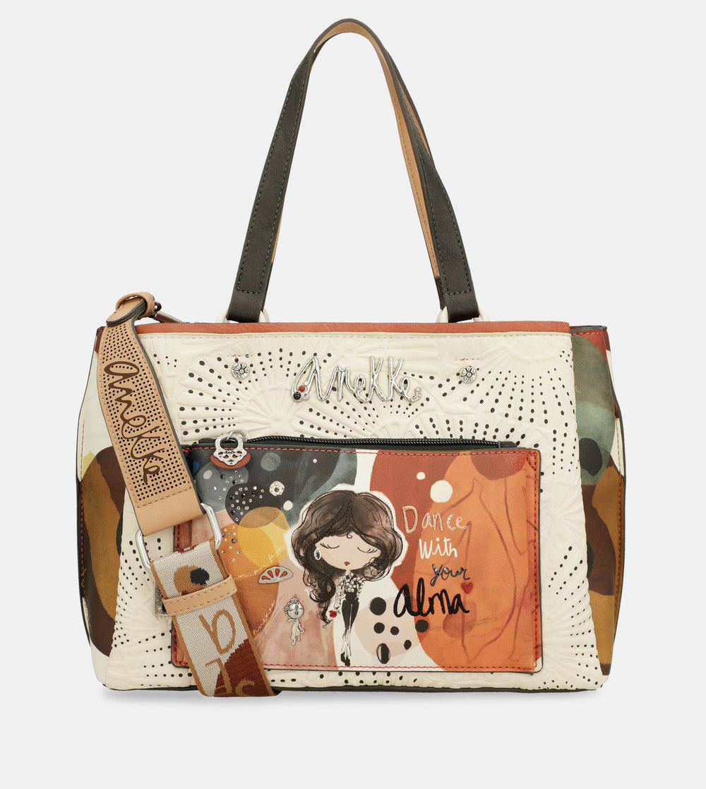 Praktická kabelka do ruky s motívom kolekcie Anekke Alma. Na zadnej vonkajšej strane je vrecko na zips. Vo vnútri je otvorené vrecko na mobil a kľúče, taktiež vrecko na zips na doklady. Kabelka má zapínanie na zips. Súčasťou balenia je aj popruh ktorý je nastaviteľný podľa potreby. Kabelka je balená v taške Anekke.