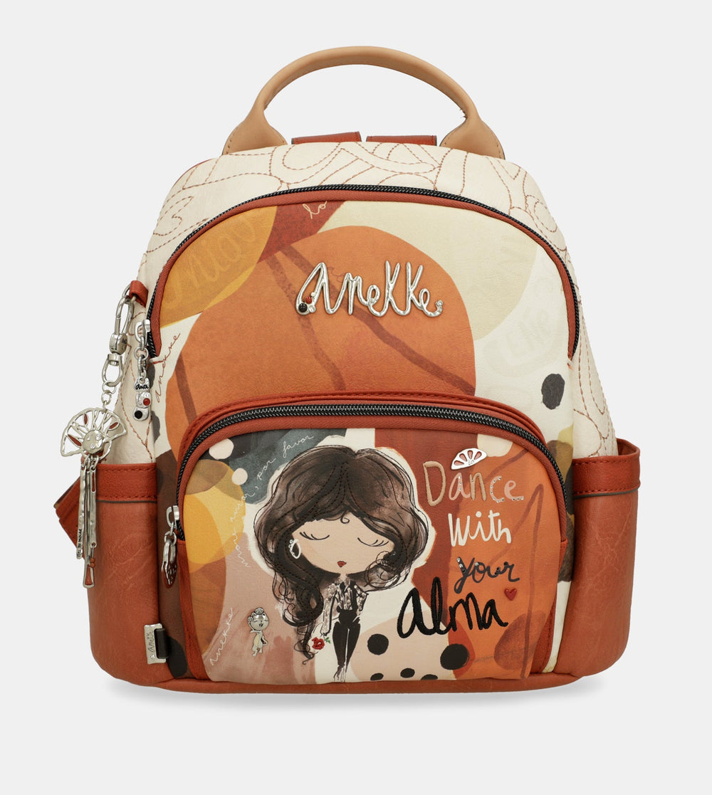 Praktický batoh s motívom kolekcie Anekke Alma. Batoh zdobí prívesok Anekke. Na vonkajšej zadnej strane je vrecko na zips, na prednej strane je menšie vrecko na drobnosti. Vo vnútri batohu je otvorené vrecko na mobil a kľúče, taktiež vrecko so zipsom na doklady.Popruhy batohu sú nastaviteľné podľa potreby. Batoh je balený v taške Anekke.