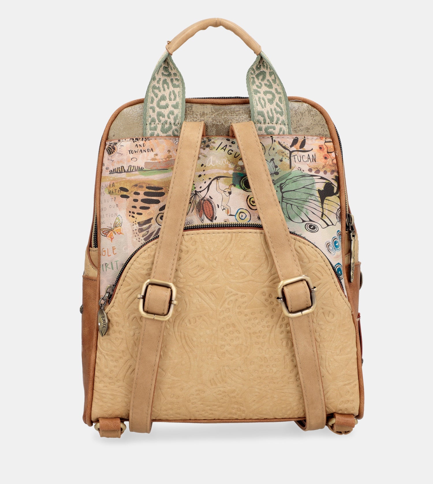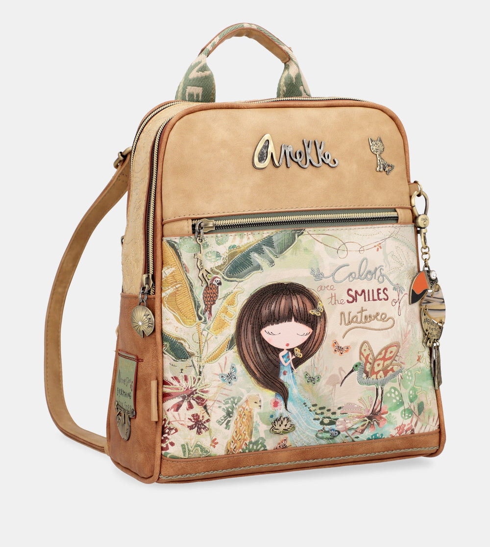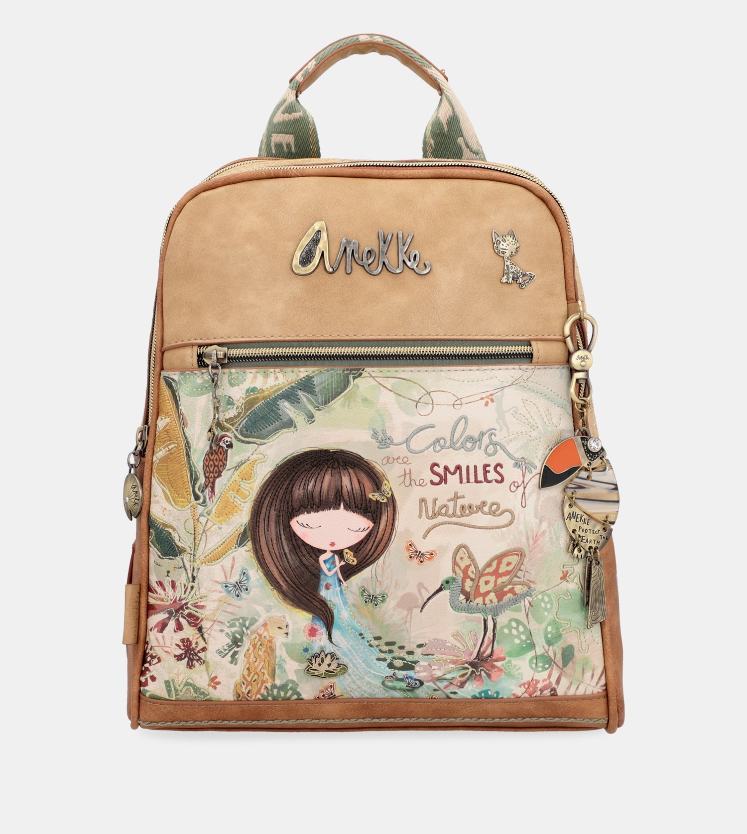 Praktický batoh s motívom kolekcie Amazonia. Batoh zdobí prívesok Anekke. Na vonkajšej zadnej strane je vrecko na zips. Vo vnútri batohu je otvorené vrecko na mobil a kľúče, taktiež vrecko so zipsom na doklady.Batoh je členený na dve časti, všetky sú uzatvárané na zips.Popruhy batohu sú nastaviteľné podľa potreby. Batoh je balený v taške Anekke.