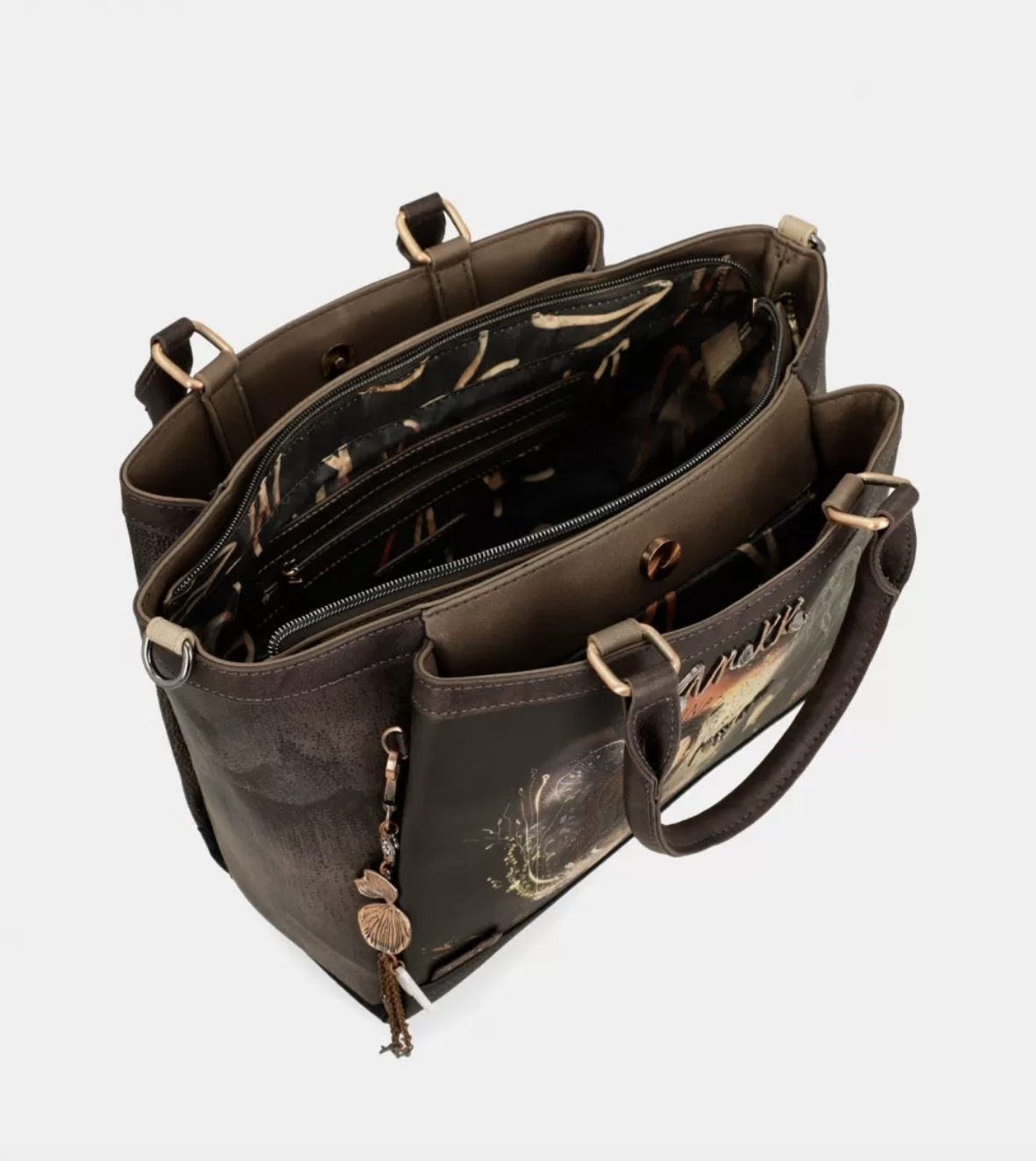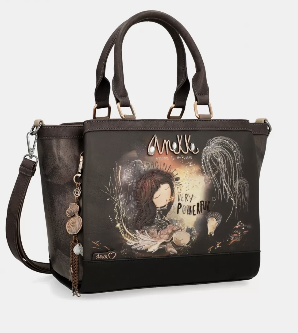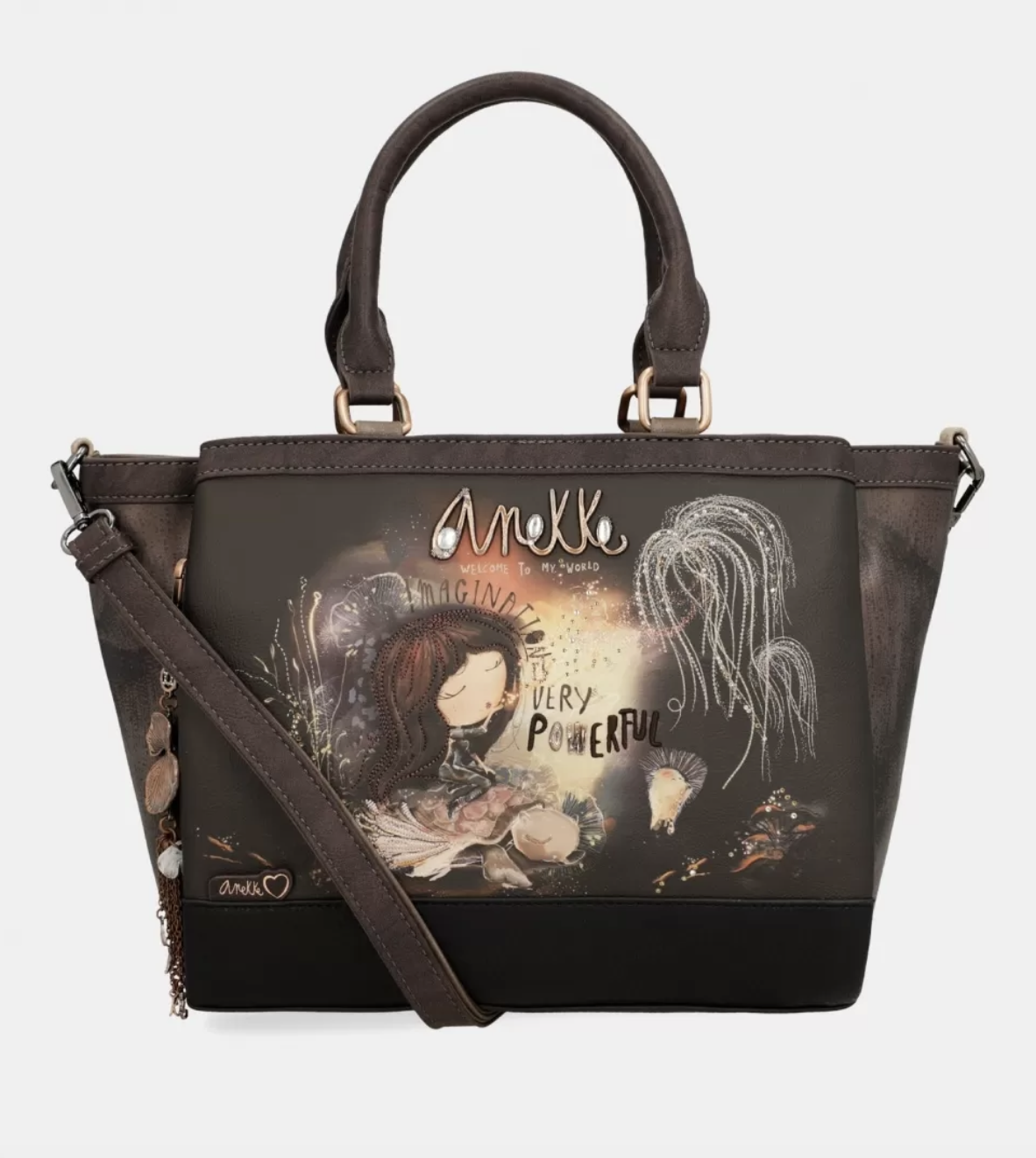 Kabelka s motívom kolekcie Anekke Dreamverse ideálna do práce. Na vonkajšej strane je vrecko na zips, taktiež vo vnútri nájdete aj vrecko na mobil a drobnosti.Kabelka má aj popruh ktorý je nastaviteľný podľa potreby.Kabelka je členená na tri časti, dve sa zapínajú na cvok a jedna stredná na zips.Ozdobou kabelky je prívesok Anekke. Balené v taške Anekke.