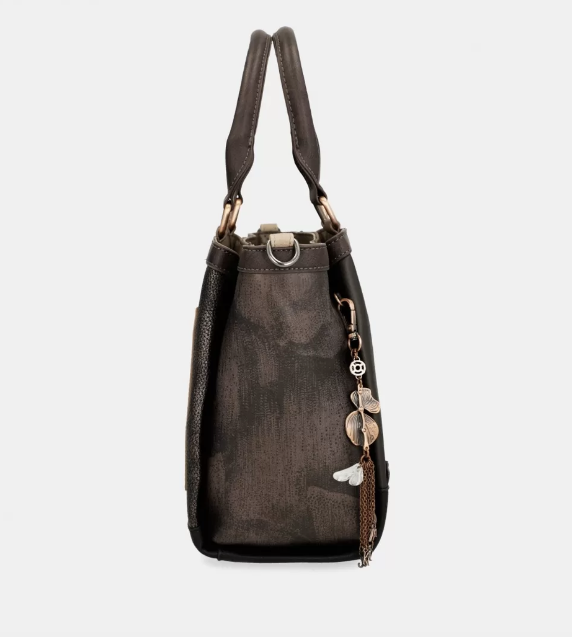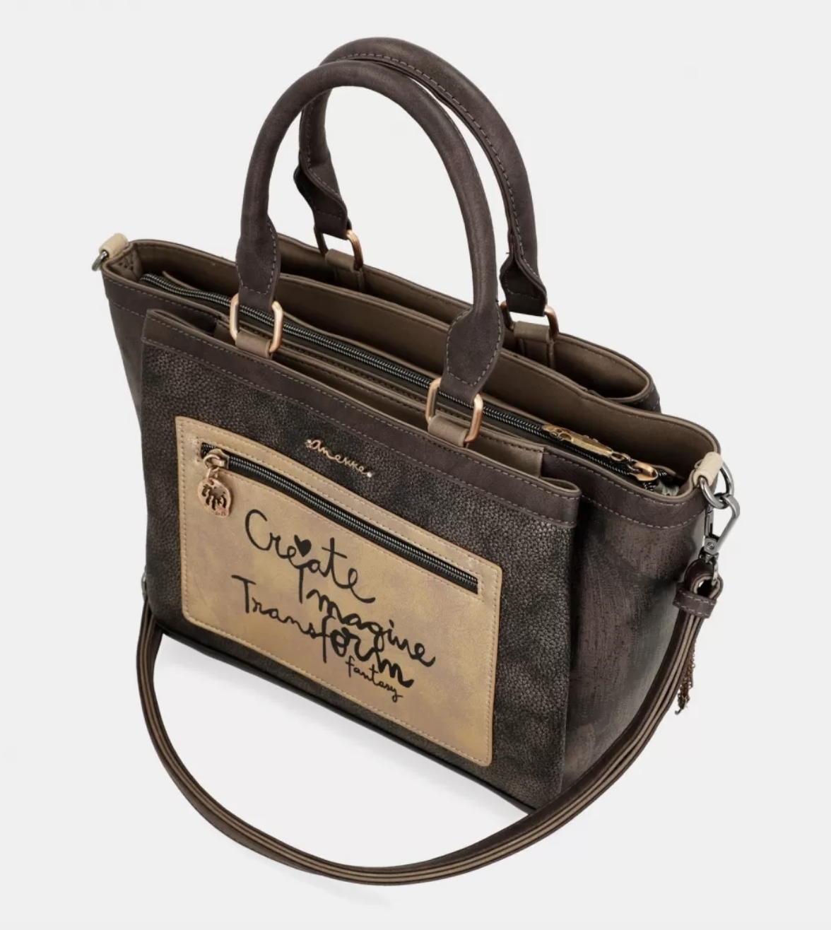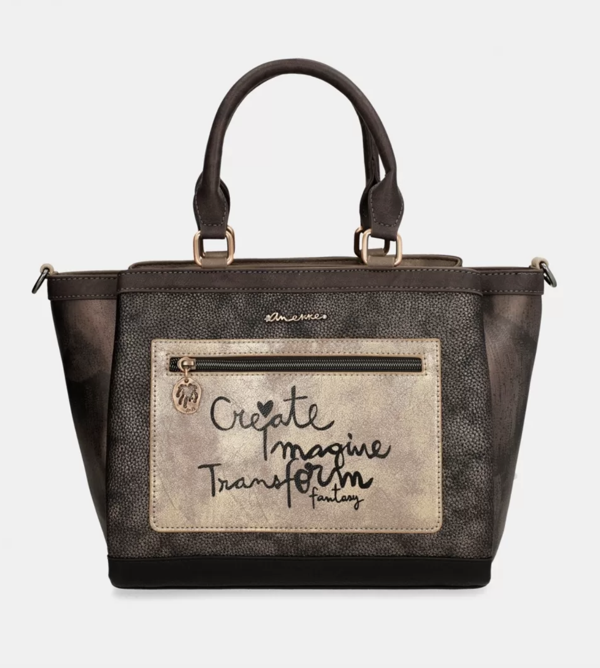 Kabelka s motívom kolekcie Anekke Dreamverse ideálna do práce. Na vonkajšej strane je vrecko na zips, taktiež vo vnútri nájdete aj vrecko na mobil a drobnosti.Kabelka má aj popruh ktorý je nastaviteľný podľa potreby.Kabelka je členená na tri časti, dve sa zapínajú na cvok a jedna stredná na zips.Ozdobou kabelky je prívesok Anekke. Balené v taške Anekke.