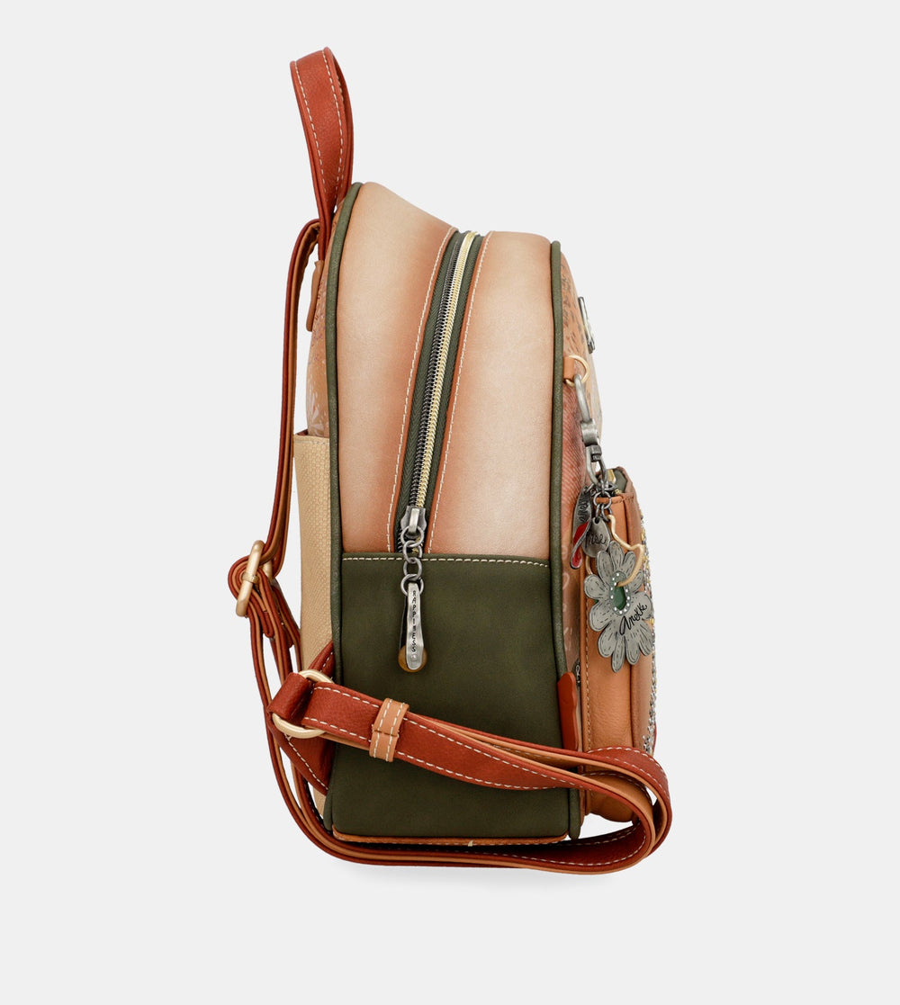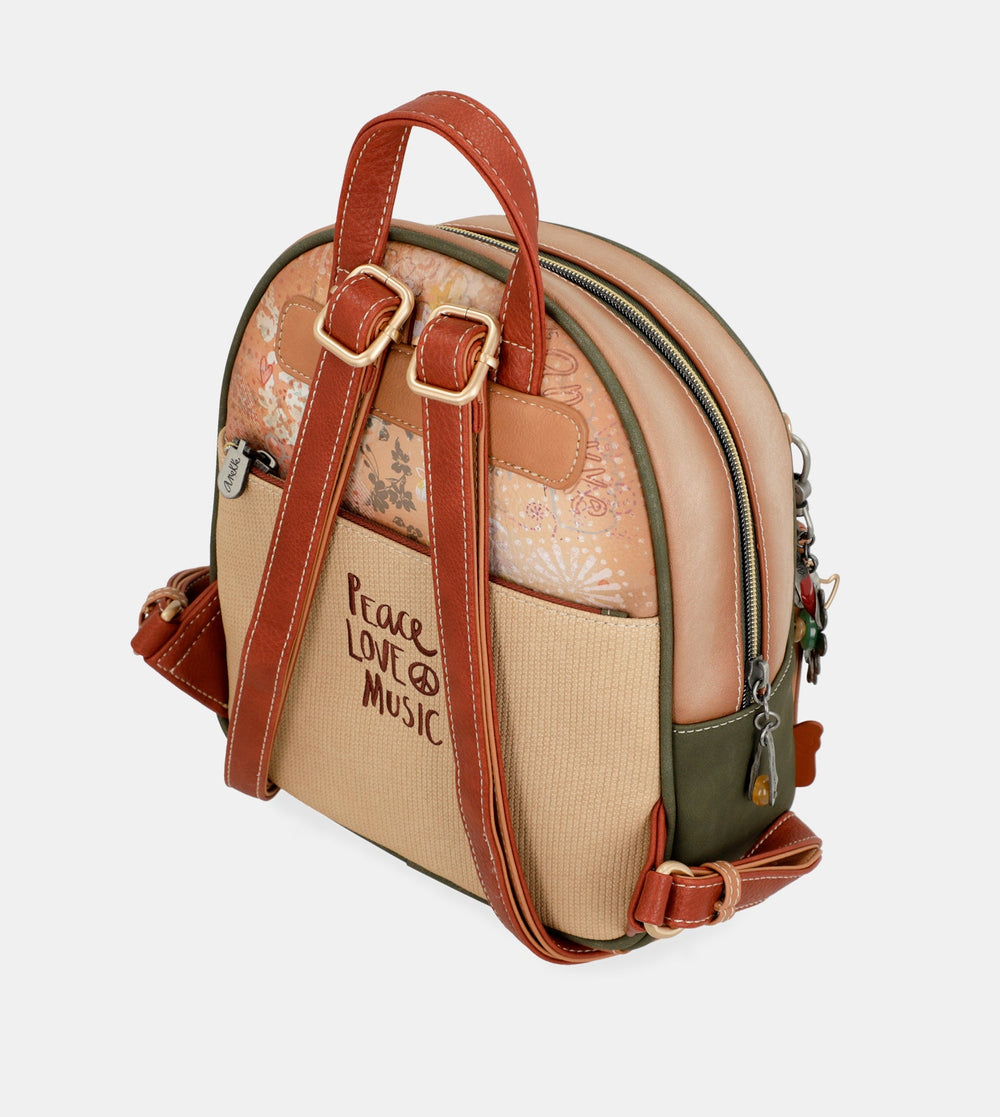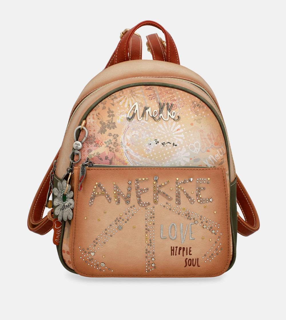 Praktický batoh s motívom kolekcie Love & Peace - Flowers. Na vonkajšej zadnej aj prednej strane je vrecko na zips. Vo vnútri kabelky je otvorené vrecko na mobil a kľúče, taktiež vrecko so zipsom na doklady. Popruhy batohu sú nastaviteľné podľa potreby. Batoh je balený v taške Anekke.