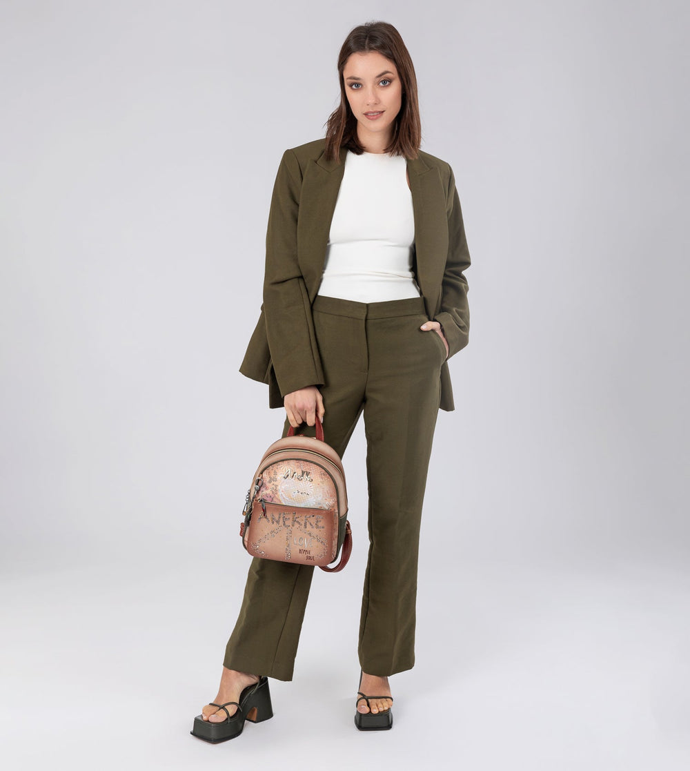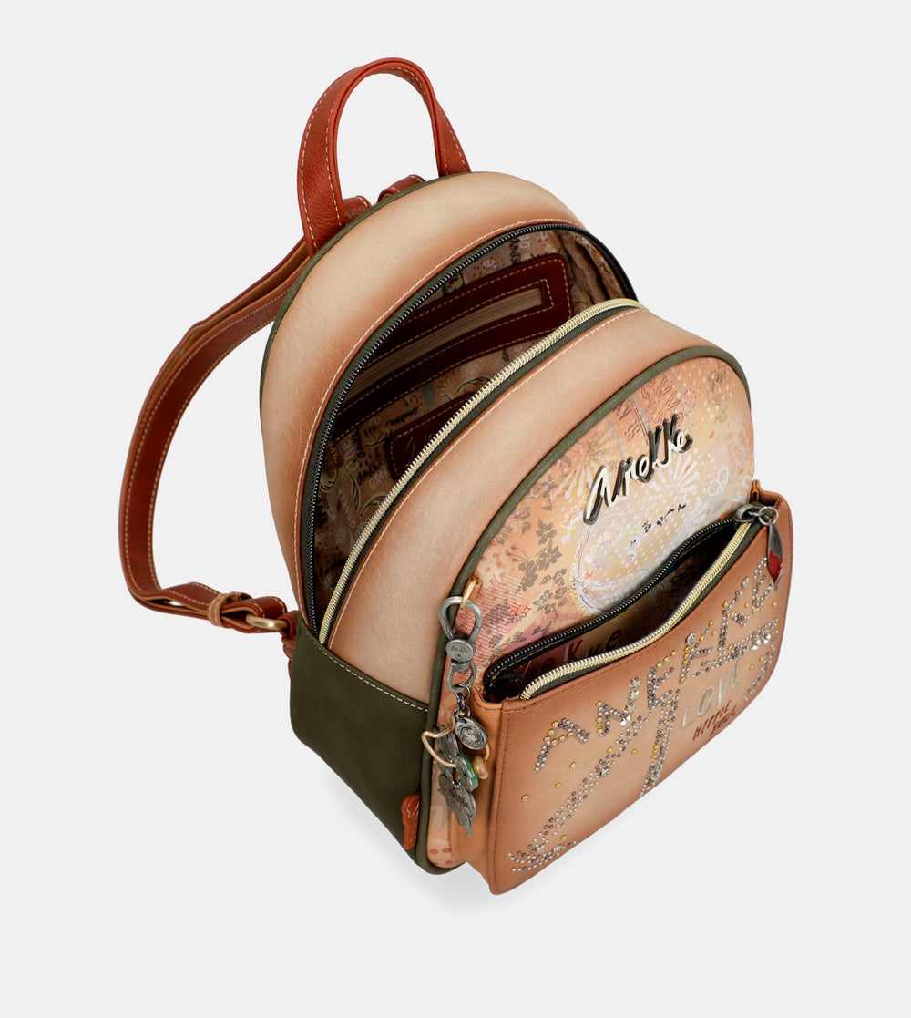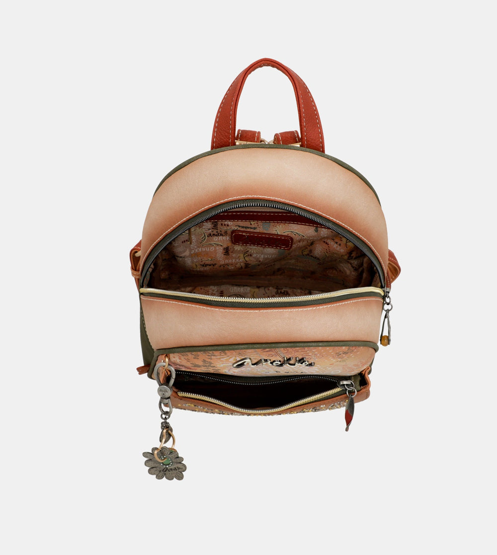 Praktický batoh s motívom kolekcie Love & Peace - Flowers. Na vonkajšej zadnej aj prednej strane je vrecko na zips. Vo vnútri kabelky je otvorené vrecko na mobil a kľúče, taktiež vrecko so zipsom na doklady. Popruhy batohu sú nastaviteľné podľa potreby. Batoh je balený v taške Anekke.