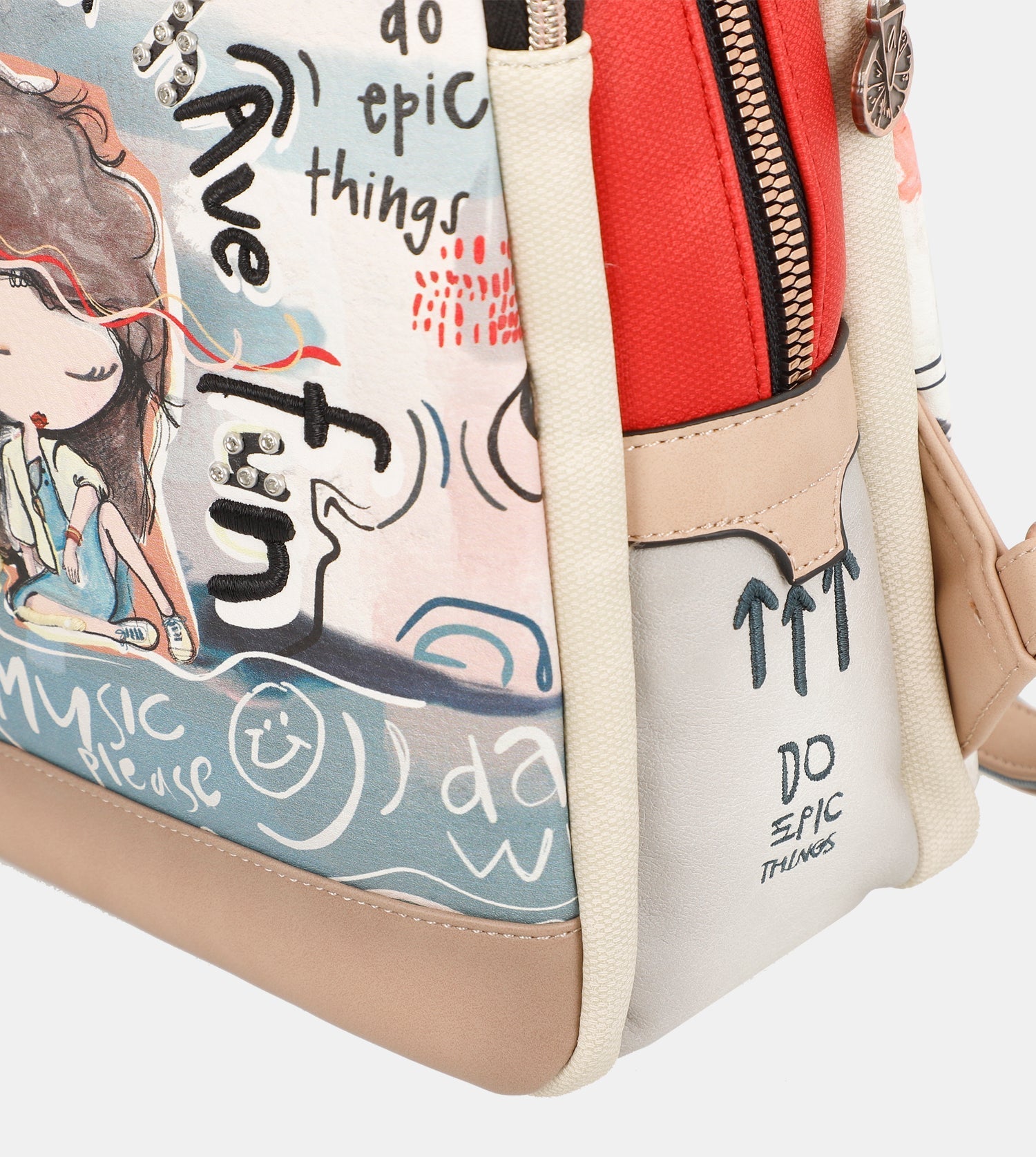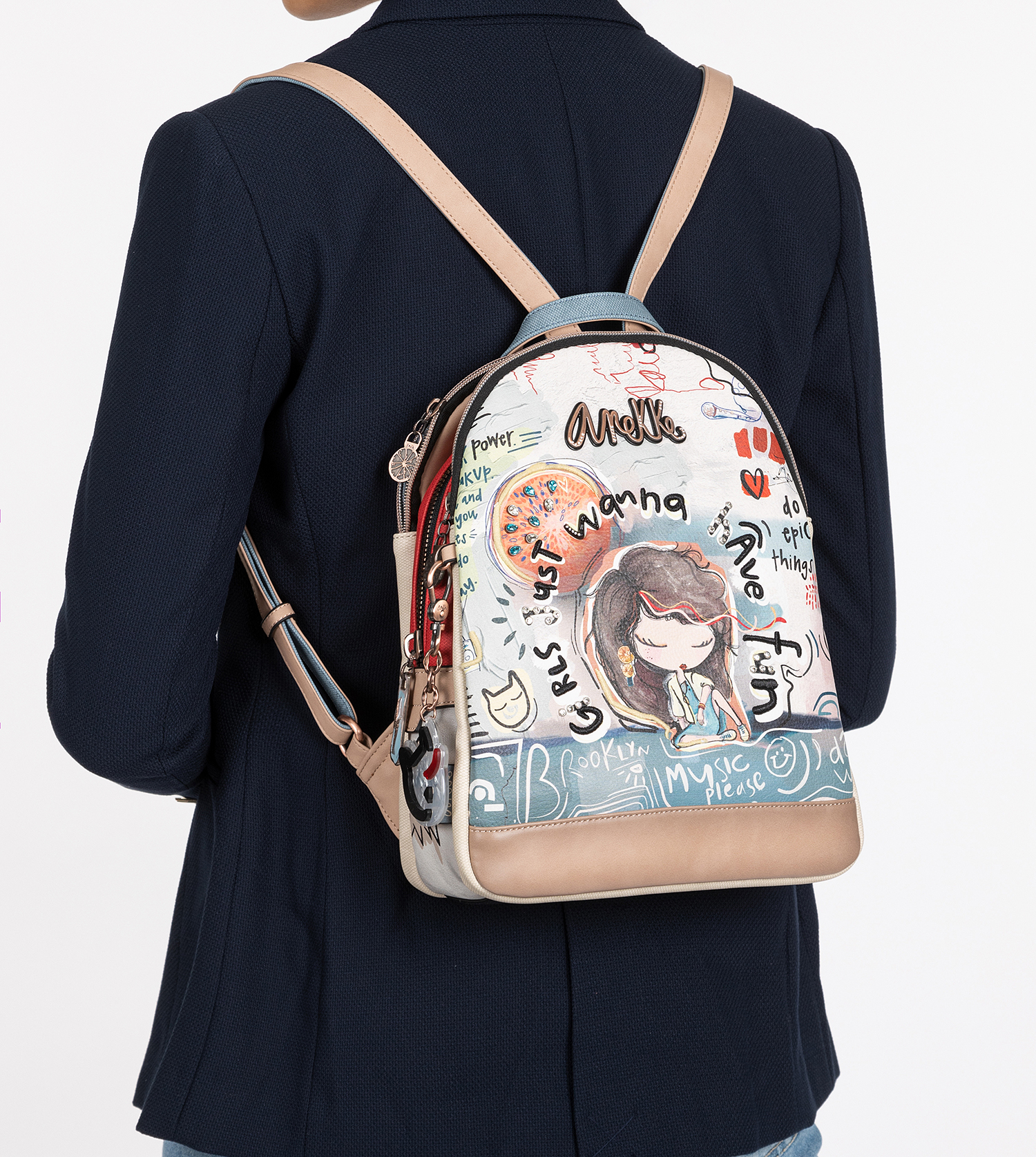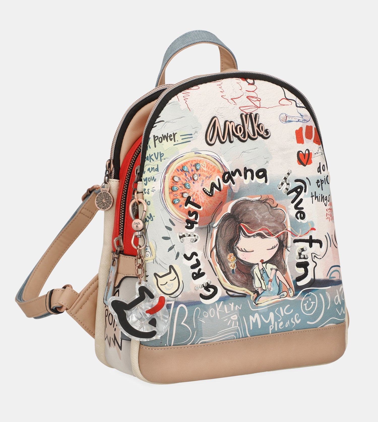 Praktický batoh s motívom Fun & Music. Batoh zdobí prívesok Anekke. Na vonkajšej zadnej strane je vrecko na zips. Batoh je členený na tri časti ktoré majú uzatváranie na zips. Vo vnútri kabelky je otvorené vrecko na mobil a kľúče, taktiež vrecko so zipsom na doklady.Popruhy batohu sú nastaviteľné podľa potreby. Batoh je balený v taške Anekke.