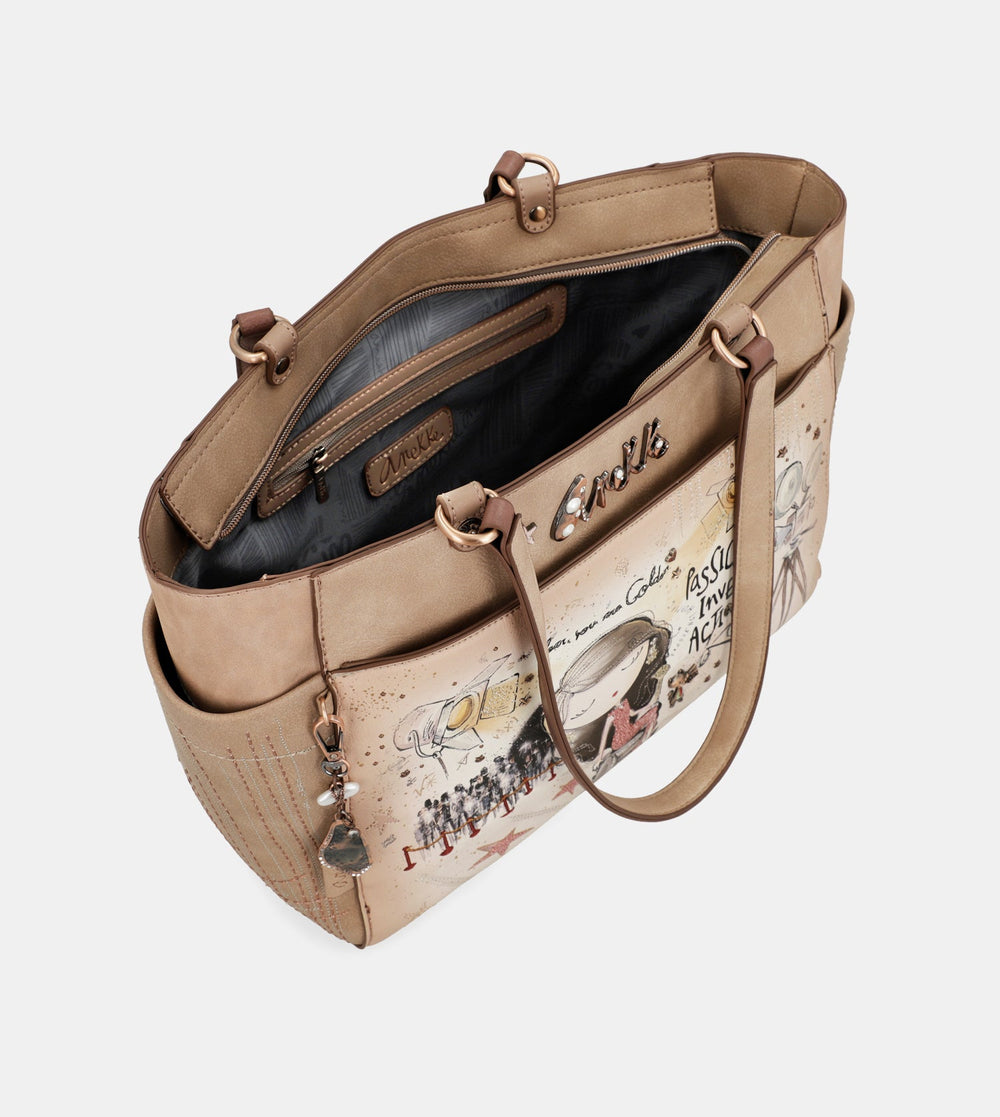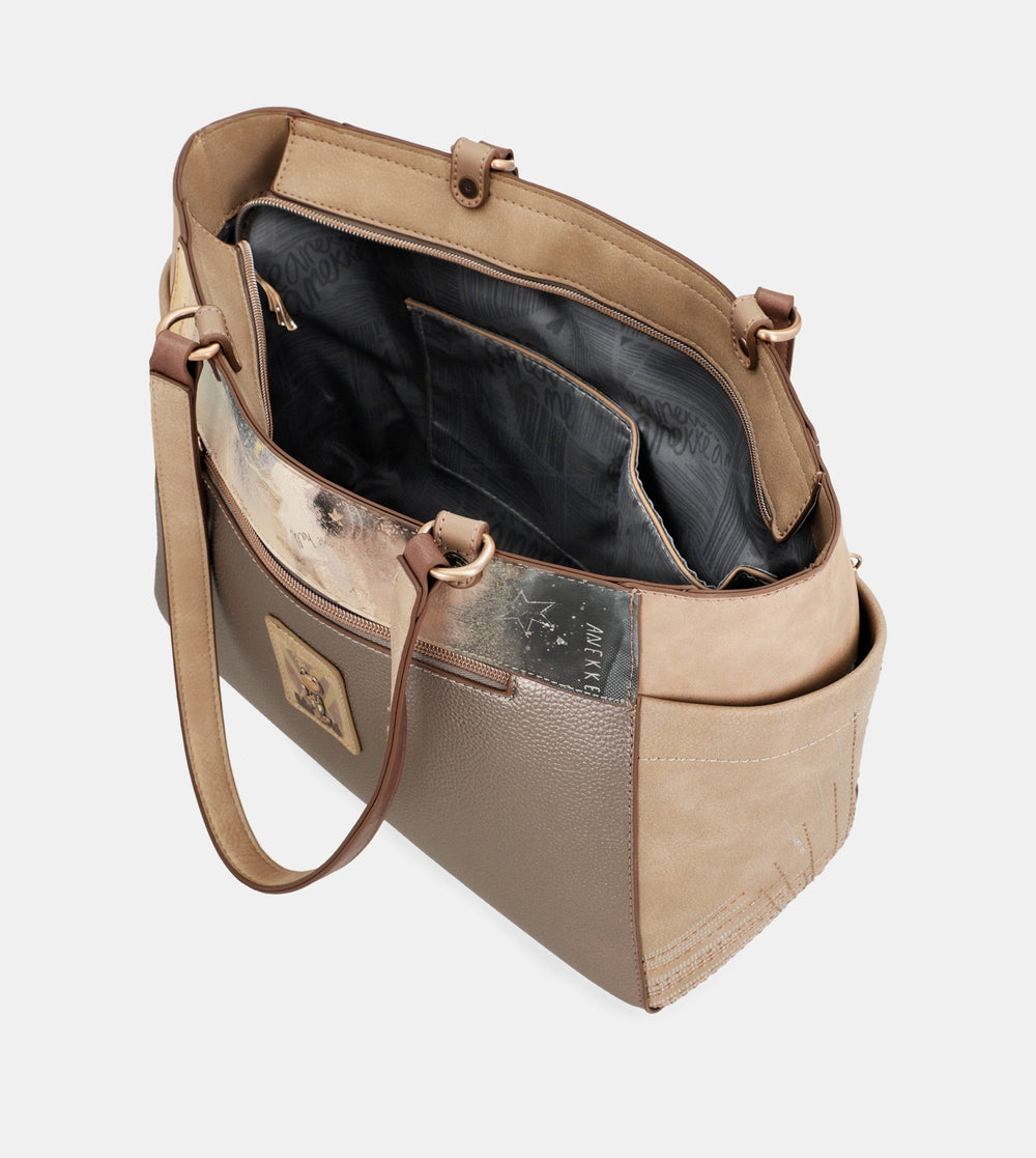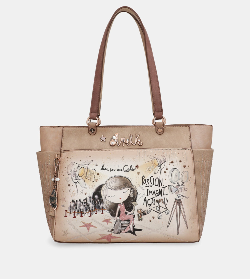 Praktická kabelka na plece s motívom kolekcie Hollywood ktorú zdobí prívesok Anekke. Na zadnej vonkajšej strane je vrecko na zips. Vo vnútri je otvorené vrecko na mobil a kľúče, taktiež vrecko na zips na doklady. Kabelka má zapínanie na zips. Kabelka je balená v taške Anekke.