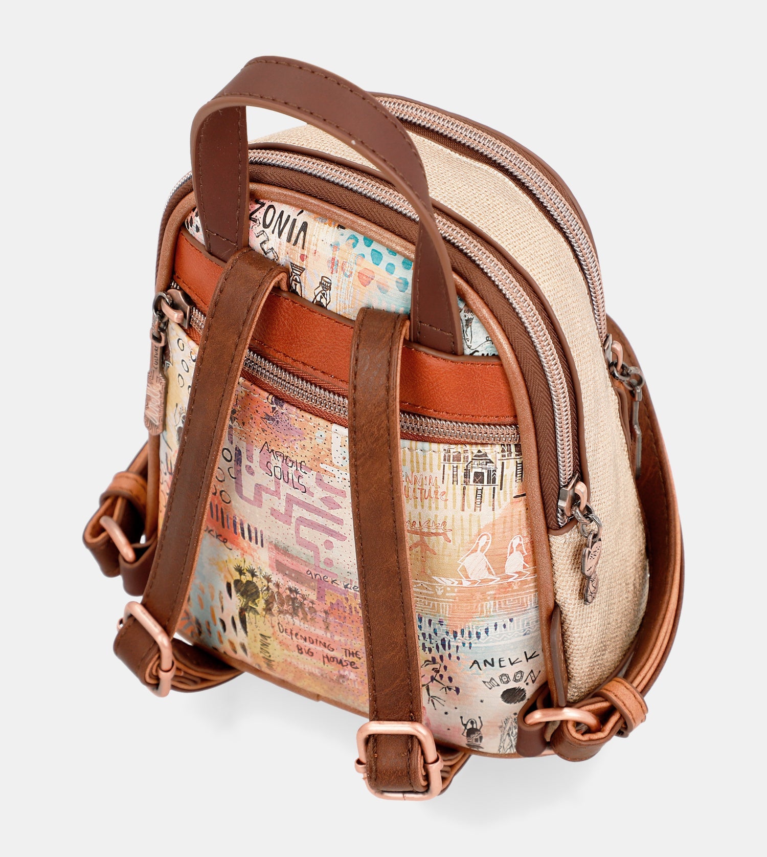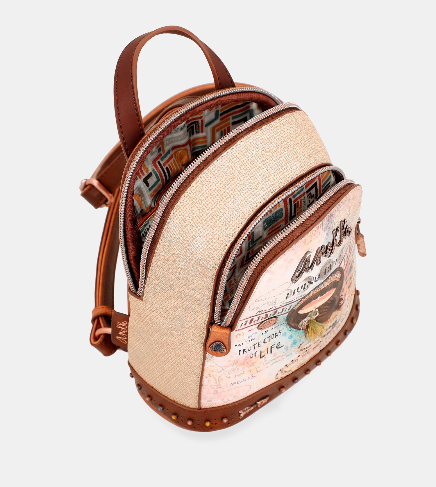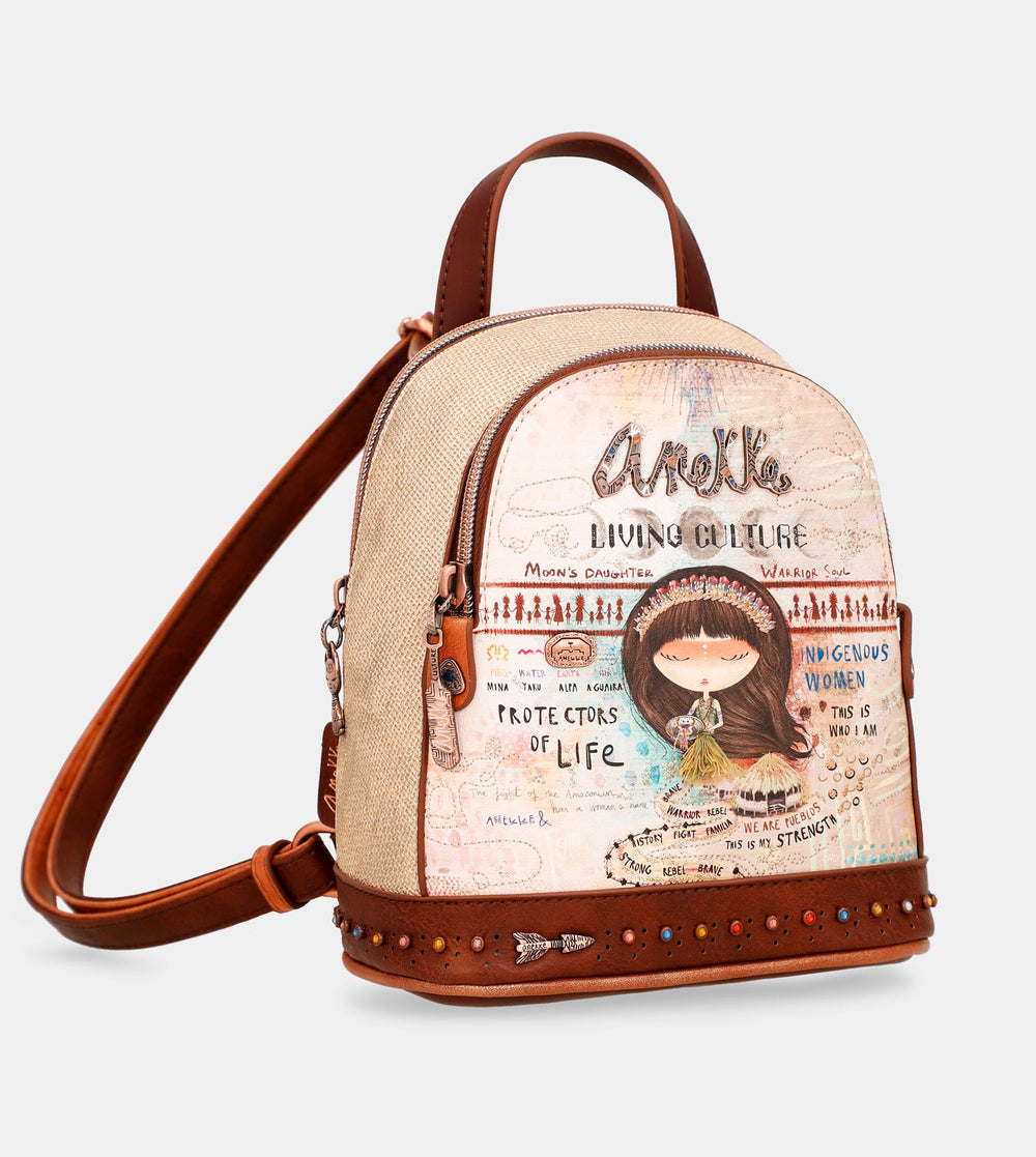 Praktický mini batoh s motívom kolekcie Menire. Na vonkajšej zadnej strane je vrecko na zips. Vo vnútri batohu je otvorené vrecko na mobil a kľúče, taktiež vrecko so zipsom na doklady.Uzatváranie je na zips.Popruhy batohu sú nastaviteľné podľa potreby. Batoh je balený v taške Anekke.