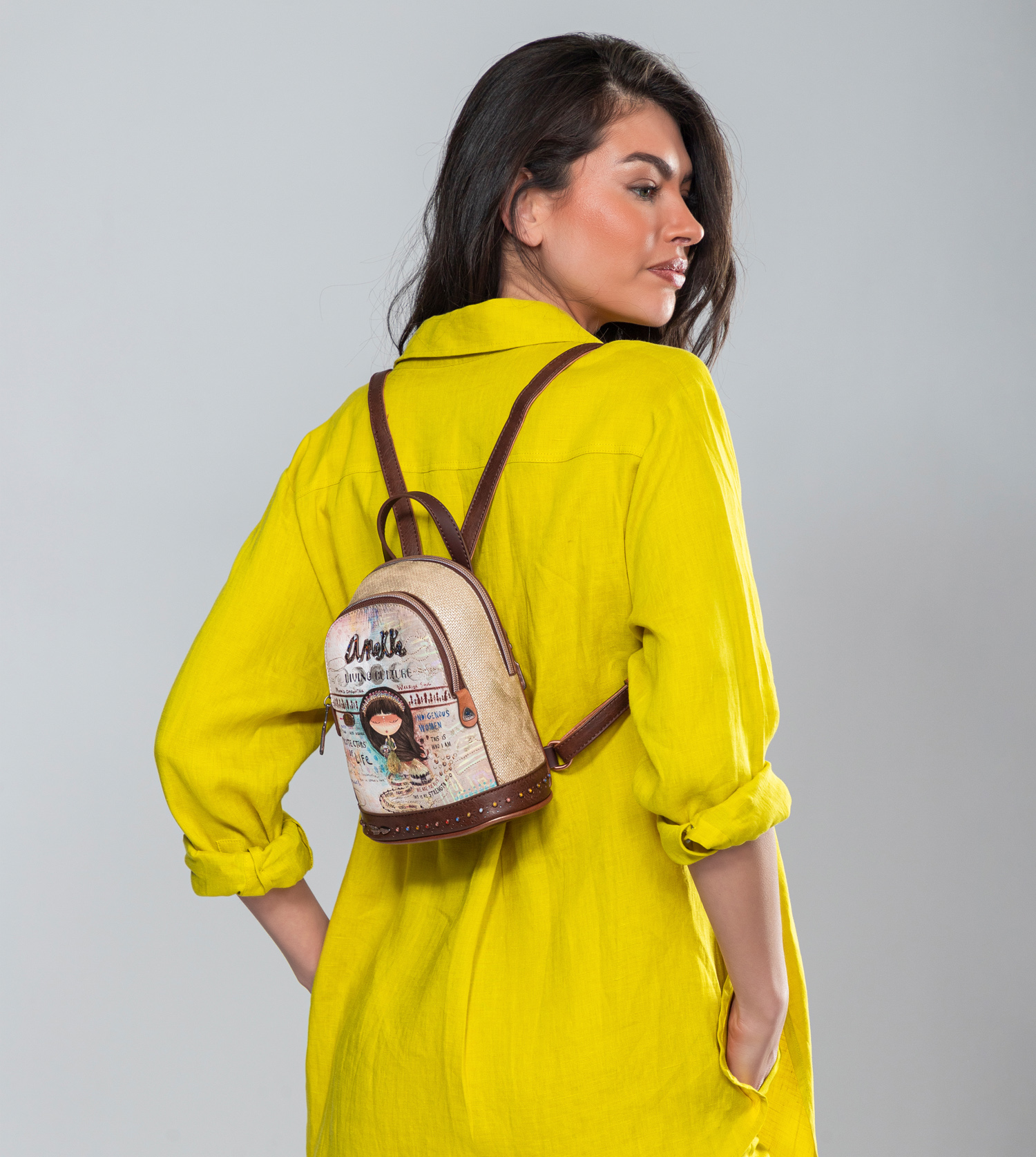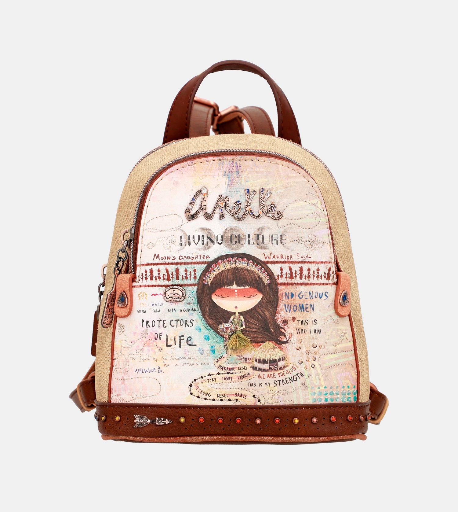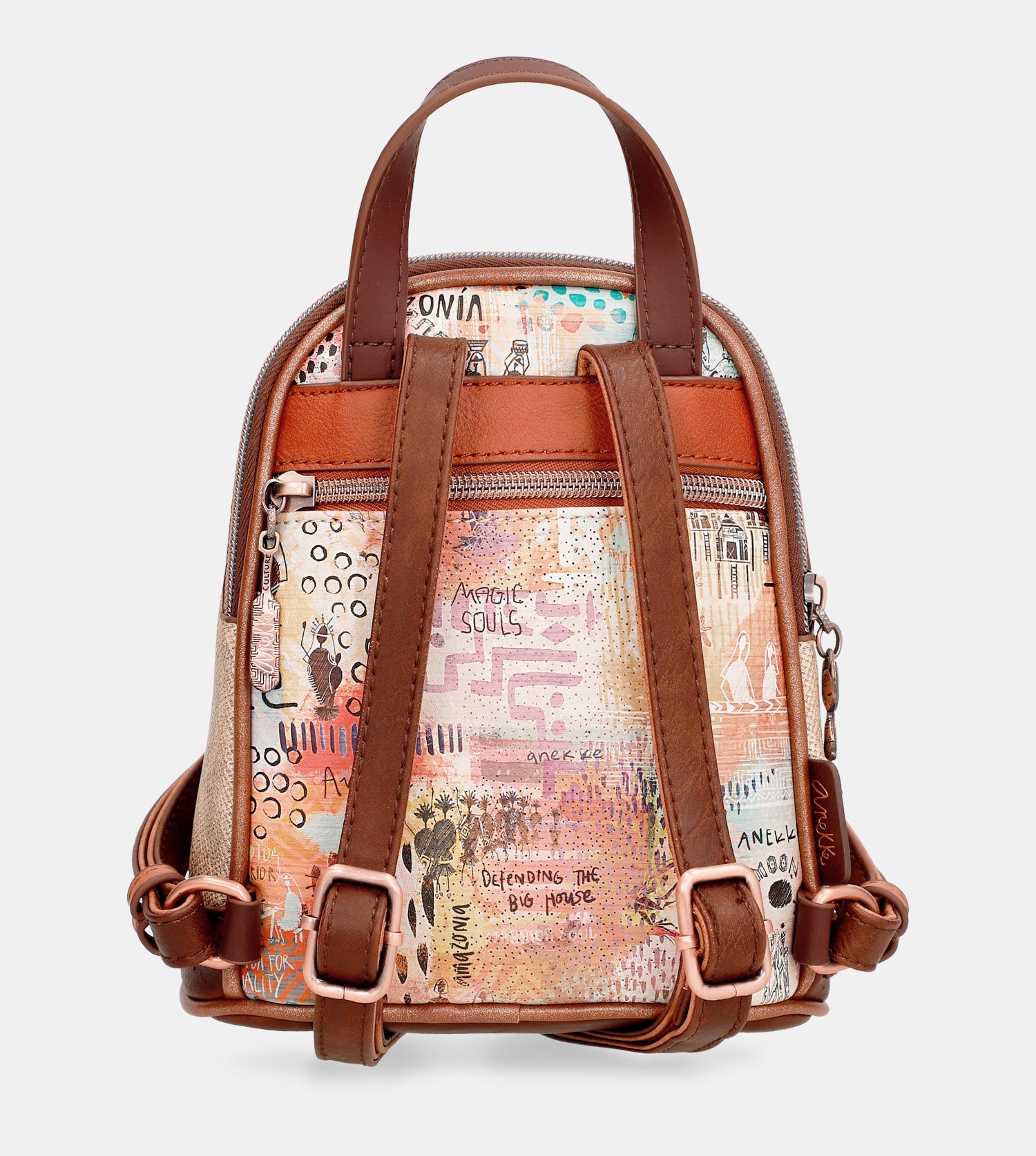 Praktický mini batoh s motívom kolekcie Menire. Na vonkajšej zadnej strane je vrecko na zips. Vo vnútri batohu je otvorené vrecko na mobil a kľúče, taktiež vrecko so zipsom na doklady.Uzatváranie je na zips.Popruhy batohu sú nastaviteľné podľa potreby. Batoh je balený v taške Anekke.