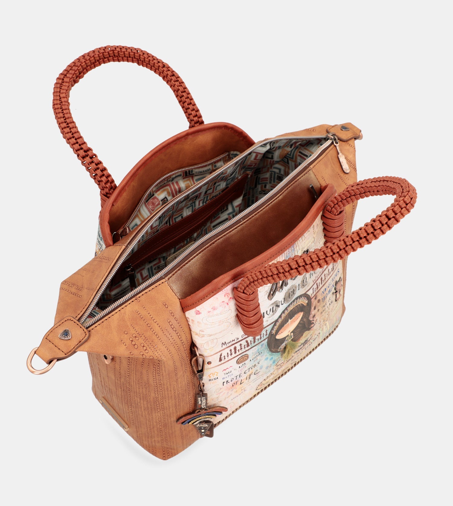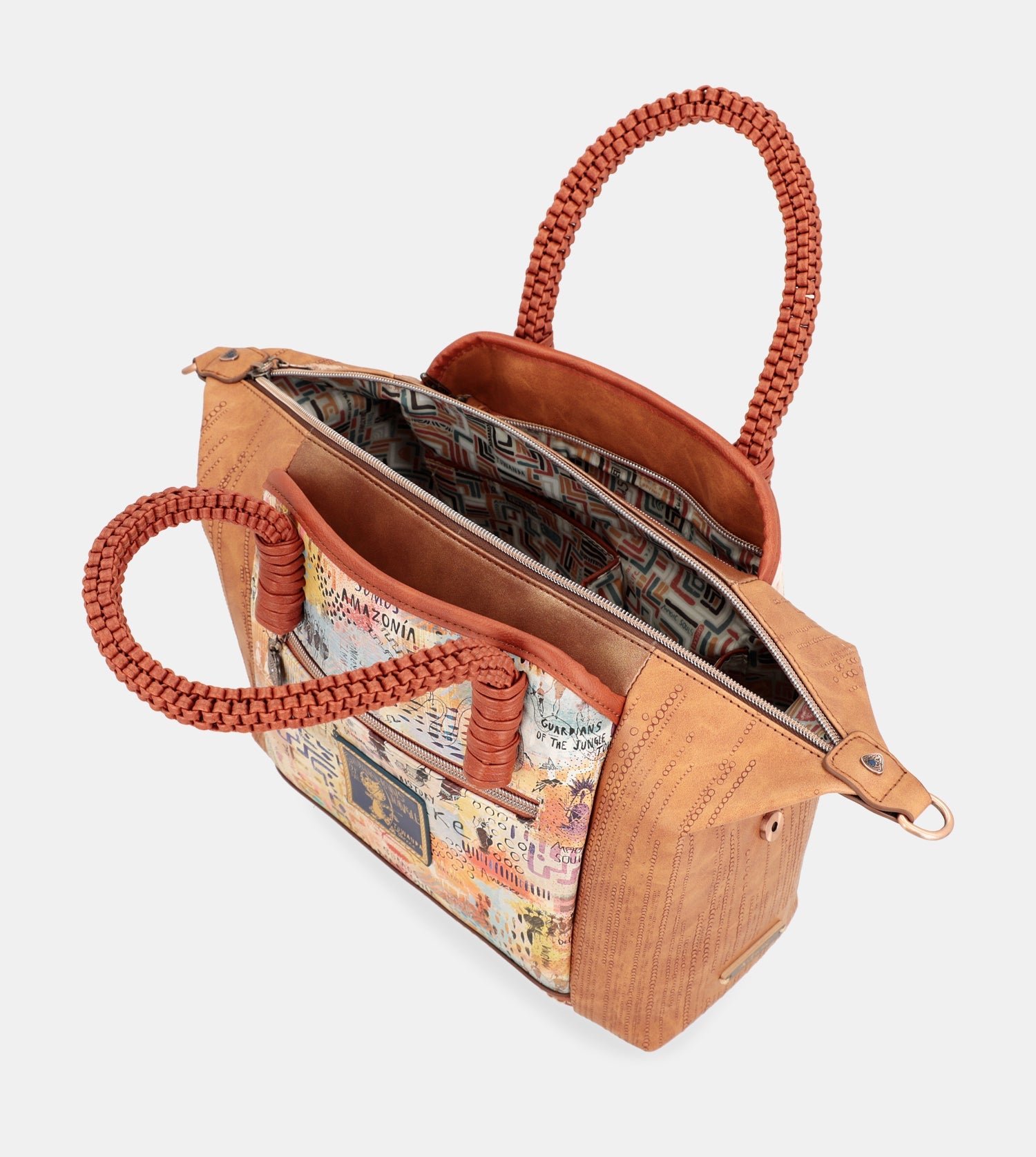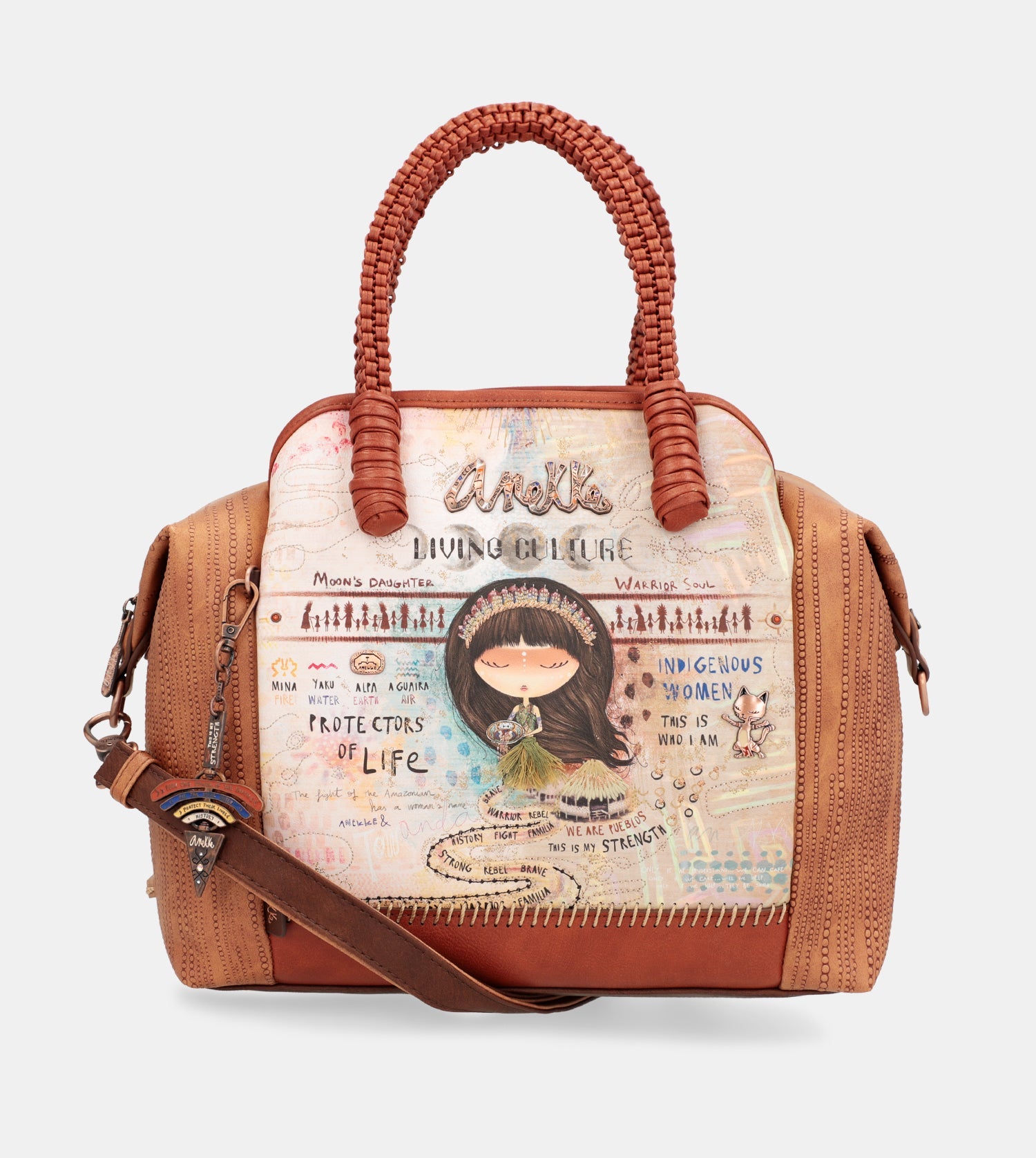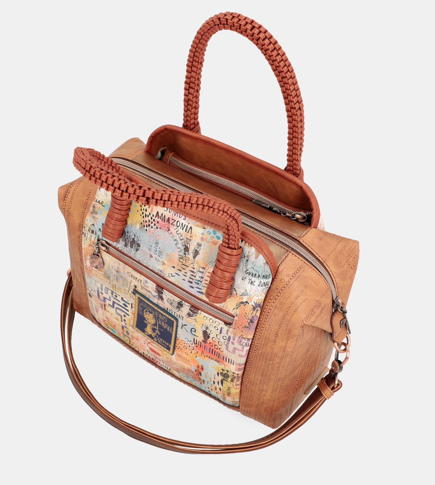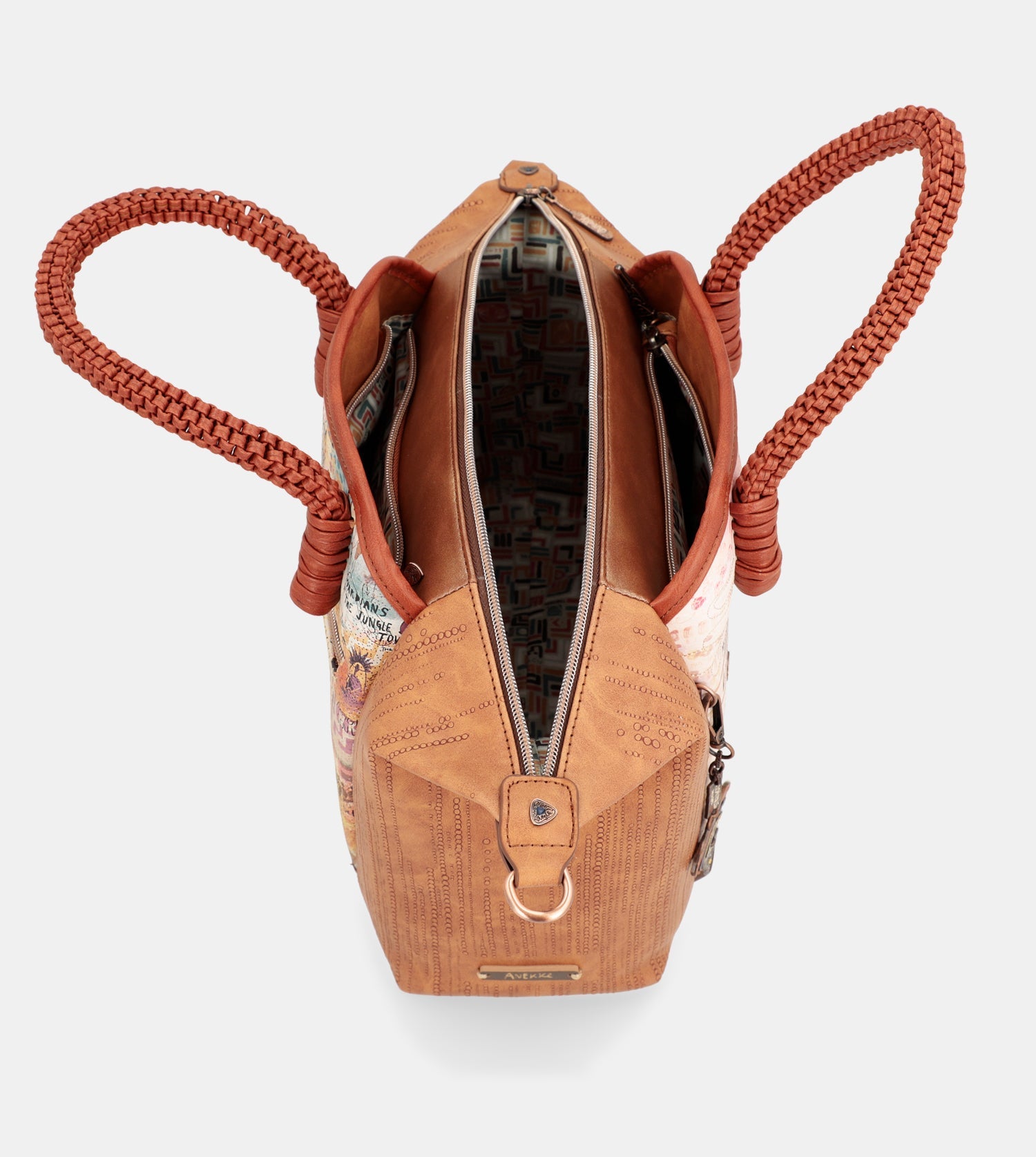 Praktická kabelka do ruky s motívom kolekcie Menire.Na zadnej vonkajšej strane je vrecko na zips. Vo vnútri je otvorené vrecko na mobil a kľúče, taktiež vrecko na zips na doklady. Kabelka má zapínanie na zips a súčastou balenia je aj popruch nastaviteľný podľa potreby. Kabelka je balená v taške Anekke.