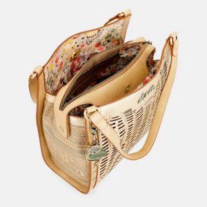 Praktická kabelka na plece s motívom kolekcie Amazonia - Pachamama Gold ♻️ ktorú zdobí prívesok Anekke. Kabelka je členená na tri časti, dve sa uzatvárajú na cvok a jedna, stredná na zips.Vo vnútri je otvorené vrecko na mobil a kľúče, taktiež vrecko na zips na doklady. Kabelka je balená v taške Anekke.