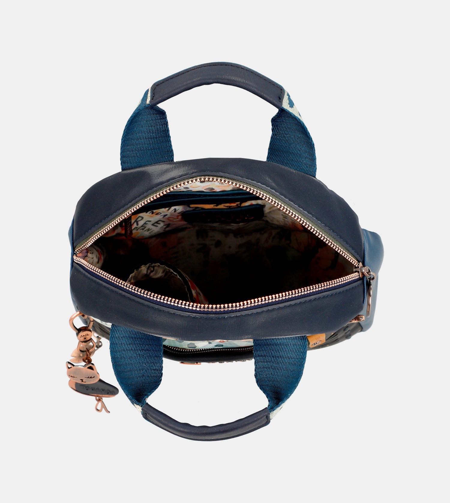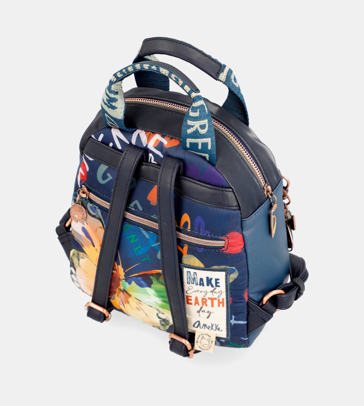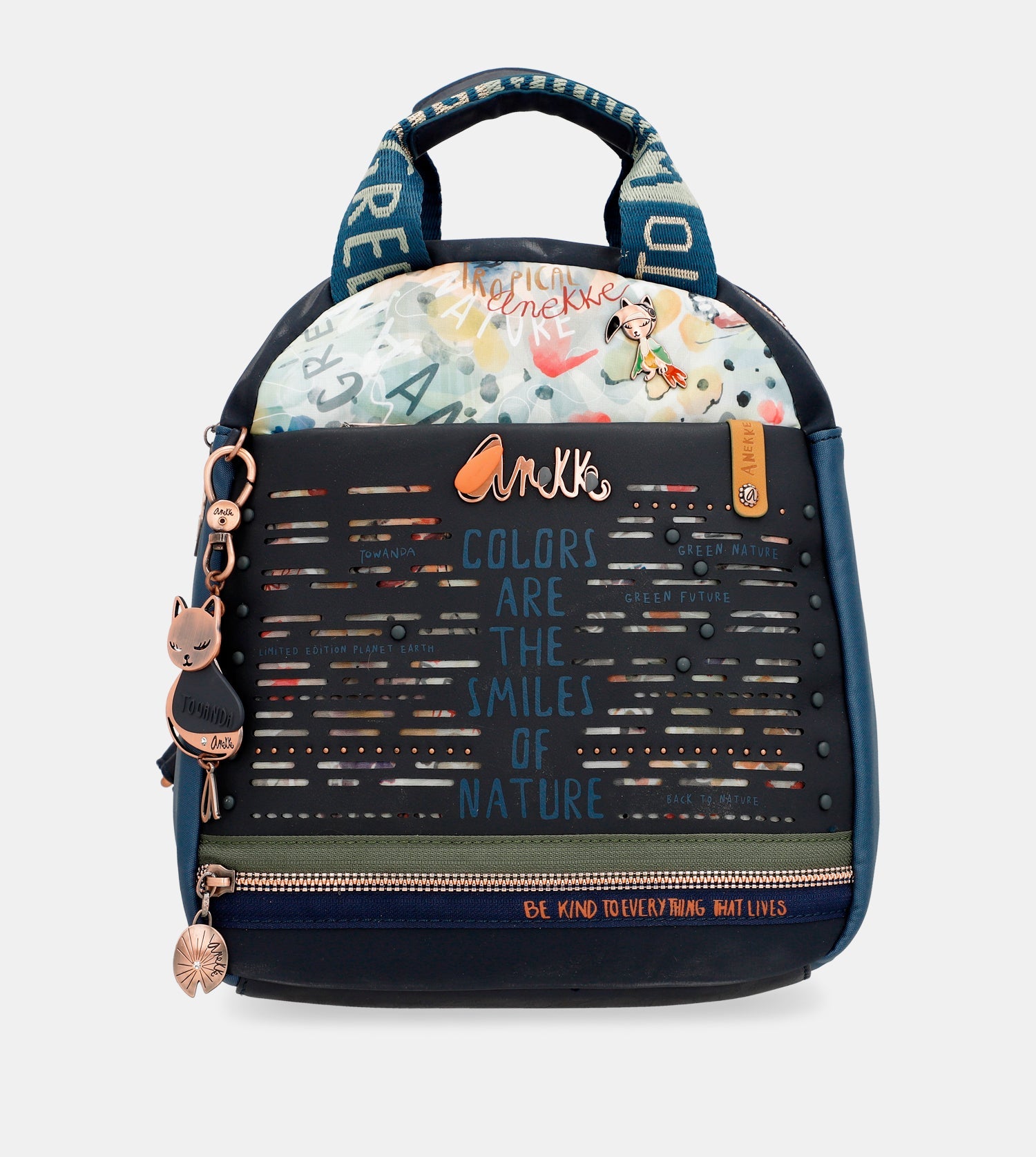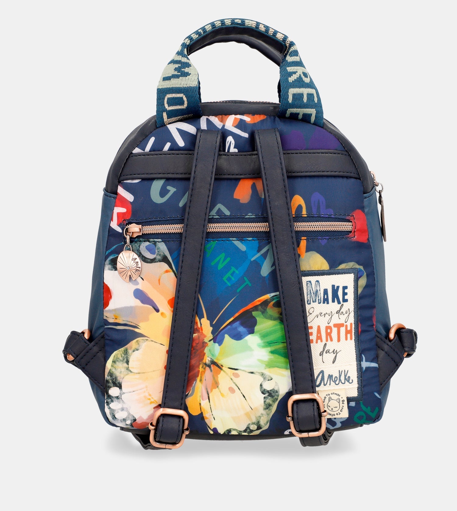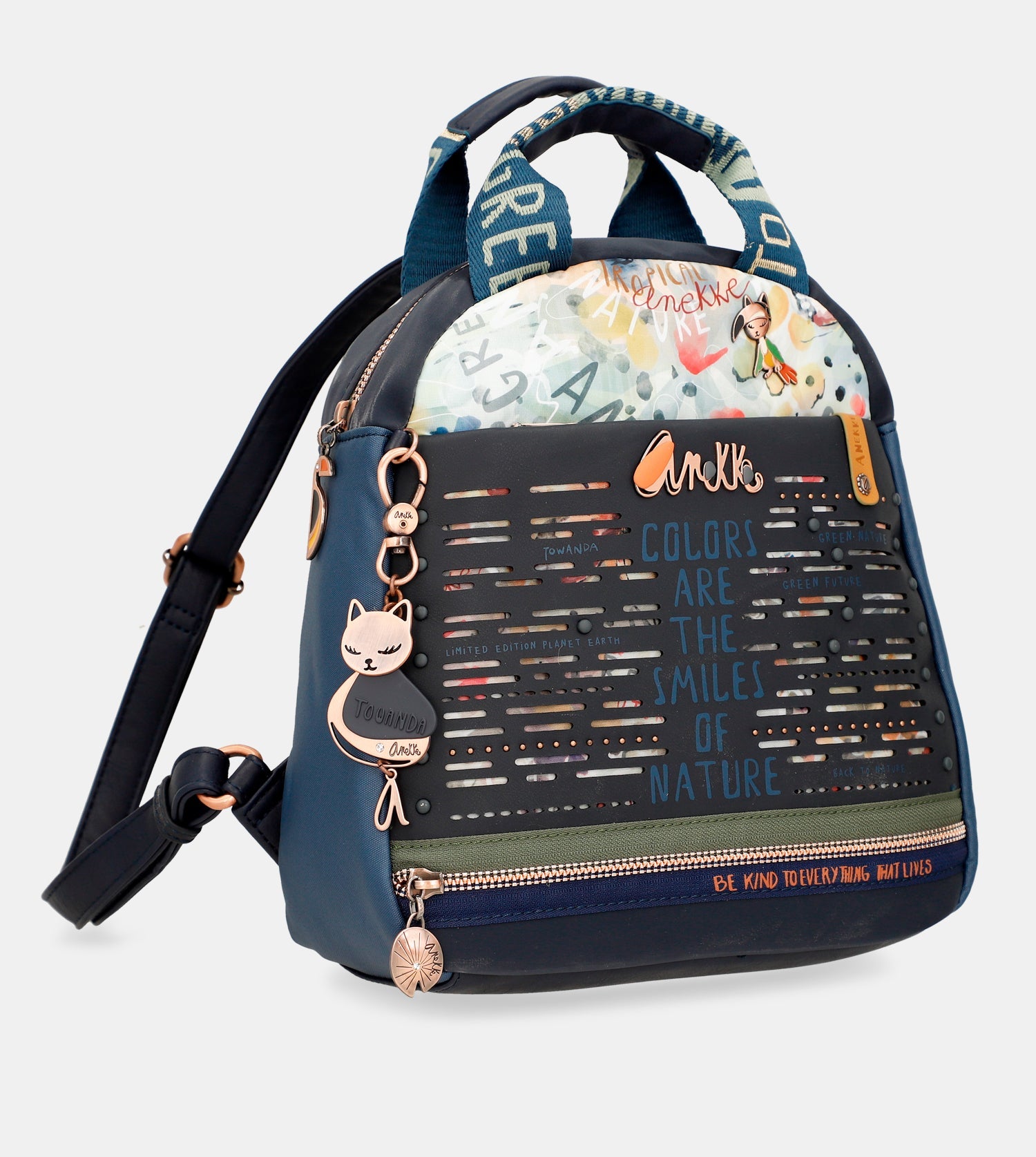 Praktický batoh s motívom kolekcie Amazonia - Pachamama Navy Blue ♻️ ktorý zdobí prívesok Anekke. Na vonkajšej zadnej strane je vrecko na zips. Vo vnútri batohu je otvorené vrecko na mobil a kľúče, taktiež vrecko so zipsom na doklady. Popruhy batohu sú nastaviteľné podľa potreby. Batoh je balený v taške Anekke.