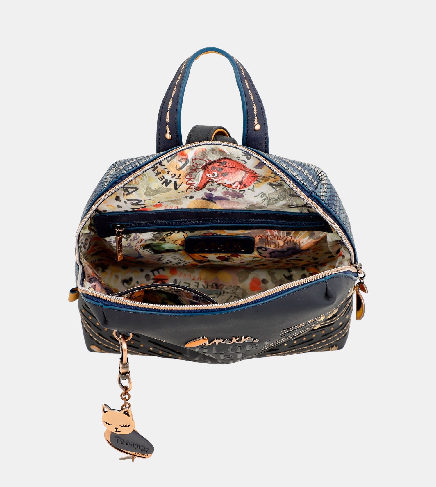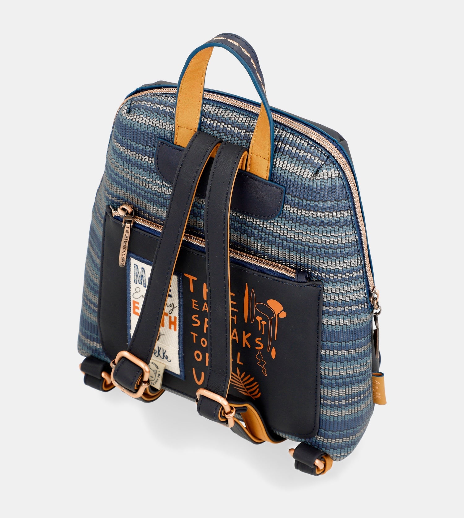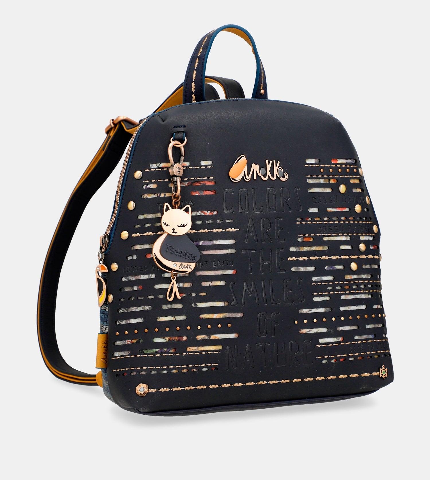 Praktický batoh s motívom kolekcie Amazonia - Pachamama Navy Blue ♻️ ktorý zdobí prívesok Anekke. Na vonkajšej zadnej strane je vrecko na zips. Vo vnútri batohu je otvorené vrecko na mobil a kľúče, taktiež vrecko so zipsom na doklady. Popruhy batohu sú nastaviteľné podľa potreby. Batoh je balený v taške Anekke.