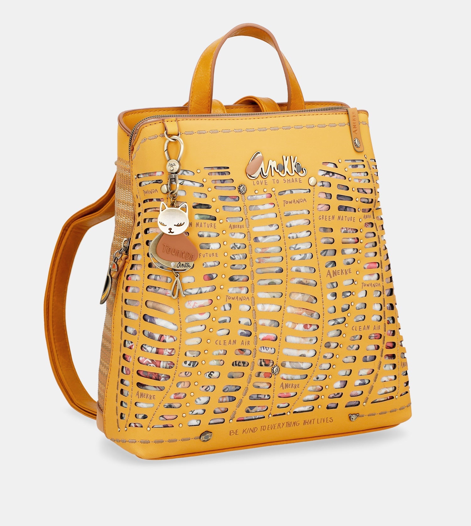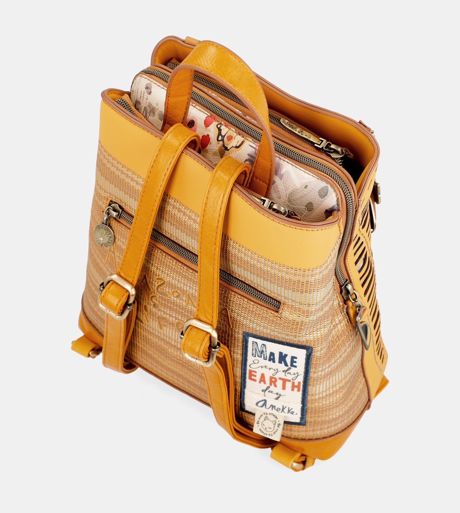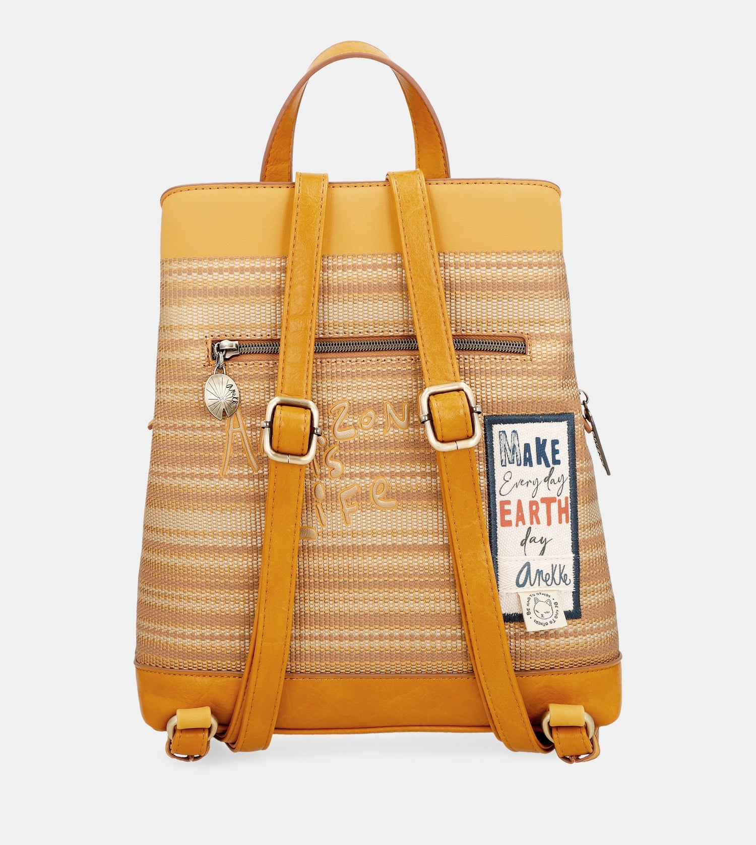 Praktický batoh s motívom kolekcie Amazonia - Pachamama Ochre ♻️ ktorý zdobí prívesok Anekke. Batoh je členený na tri časti, uzatváranie je na zips.Na vonkajšej zadnej strane je vrecko na zips. Vo vnútri batohu je otvorené vrecko na mobil a kľúče, taktiež vrecko so zipsom na doklady. Popruhy batohu sú nastaviteľné podľa potreby. Batoh je balený v taške Anekke.
