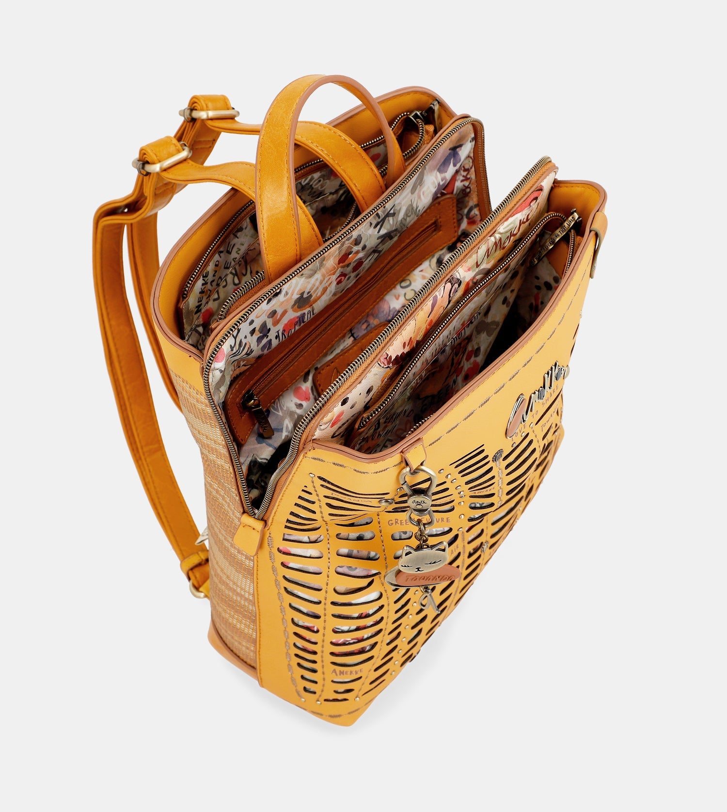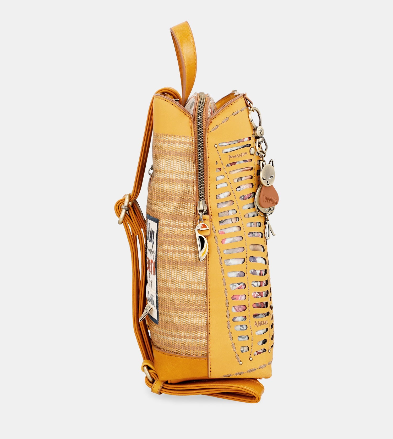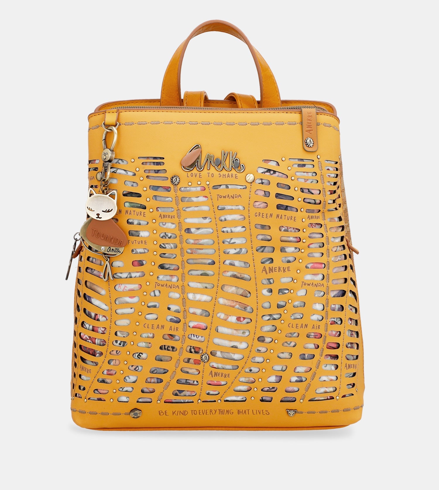 Praktický batoh s motívom kolekcie Amazonia - Pachamama Ochre ♻️ ktorý zdobí prívesok Anekke. Batoh je členený na tri časti, uzatváranie je na zips.Na vonkajšej zadnej strane je vrecko na zips. Vo vnútri batohu je otvorené vrecko na mobil a kľúče, taktiež vrecko so zipsom na doklady. Popruhy batohu sú nastaviteľné podľa potreby. Batoh je balený v taške Anekke.