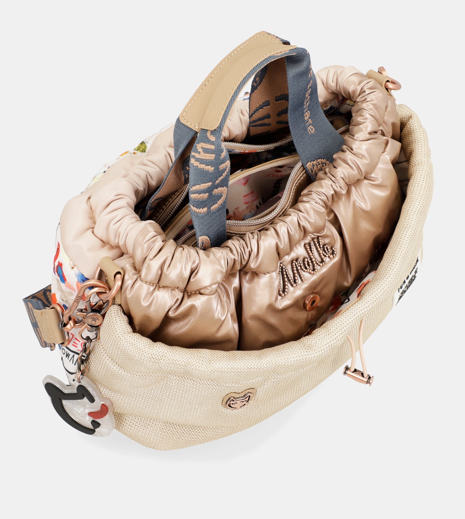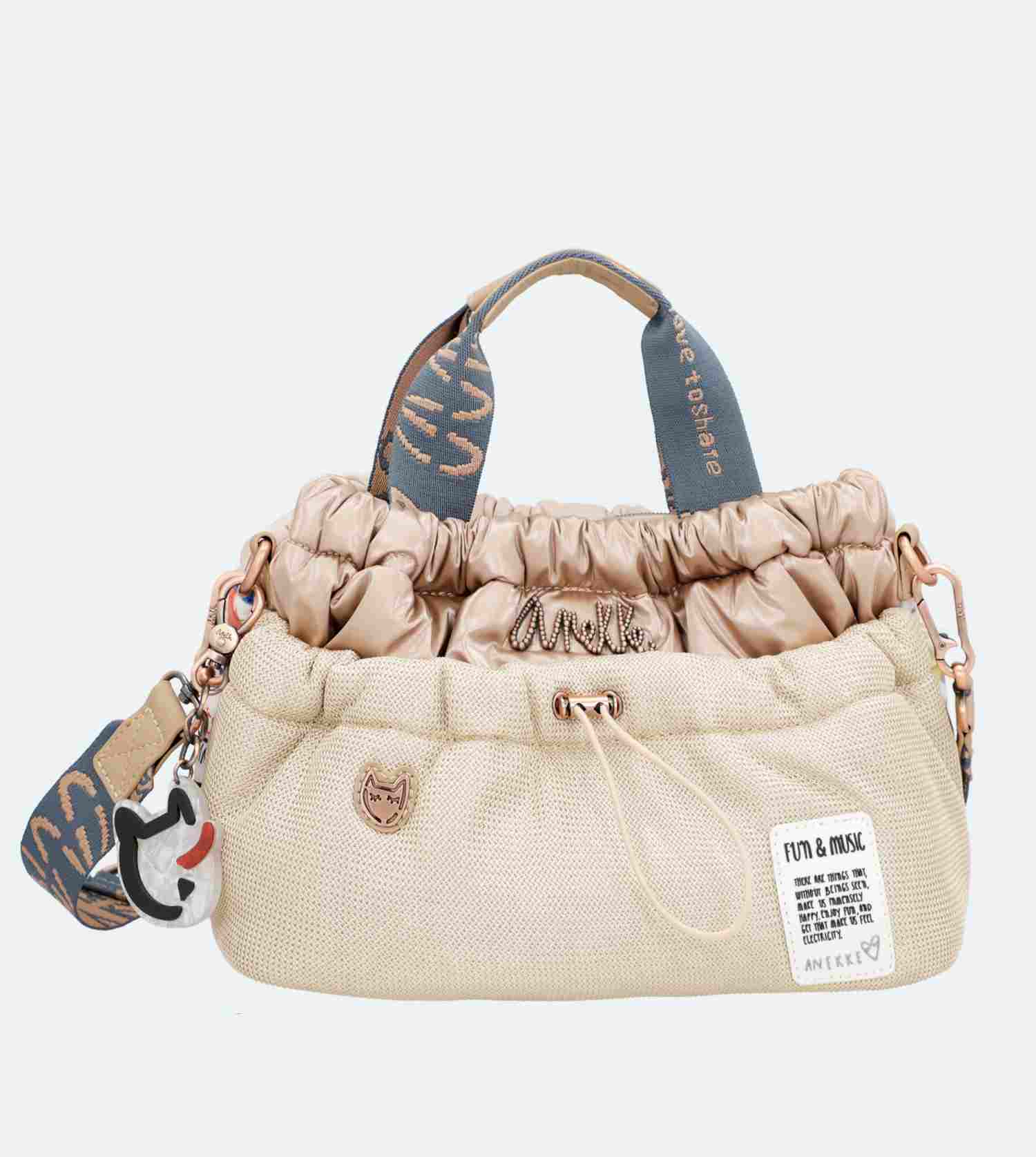 Praktická kabelka s motívom Power španielskej značky Anekke.Na vonkajšej zadnej strane je vrecko na zips na uloženie drobností. Vo vnútornej časti sú otvorené vrecká na mobil a kľúče, taktiež vrecko so zipsom na doklady. Kabelka má aj dlhý popruh, ktorý je nastaviteľný podľa potreby.Kabelka je balená v taške Anekke.