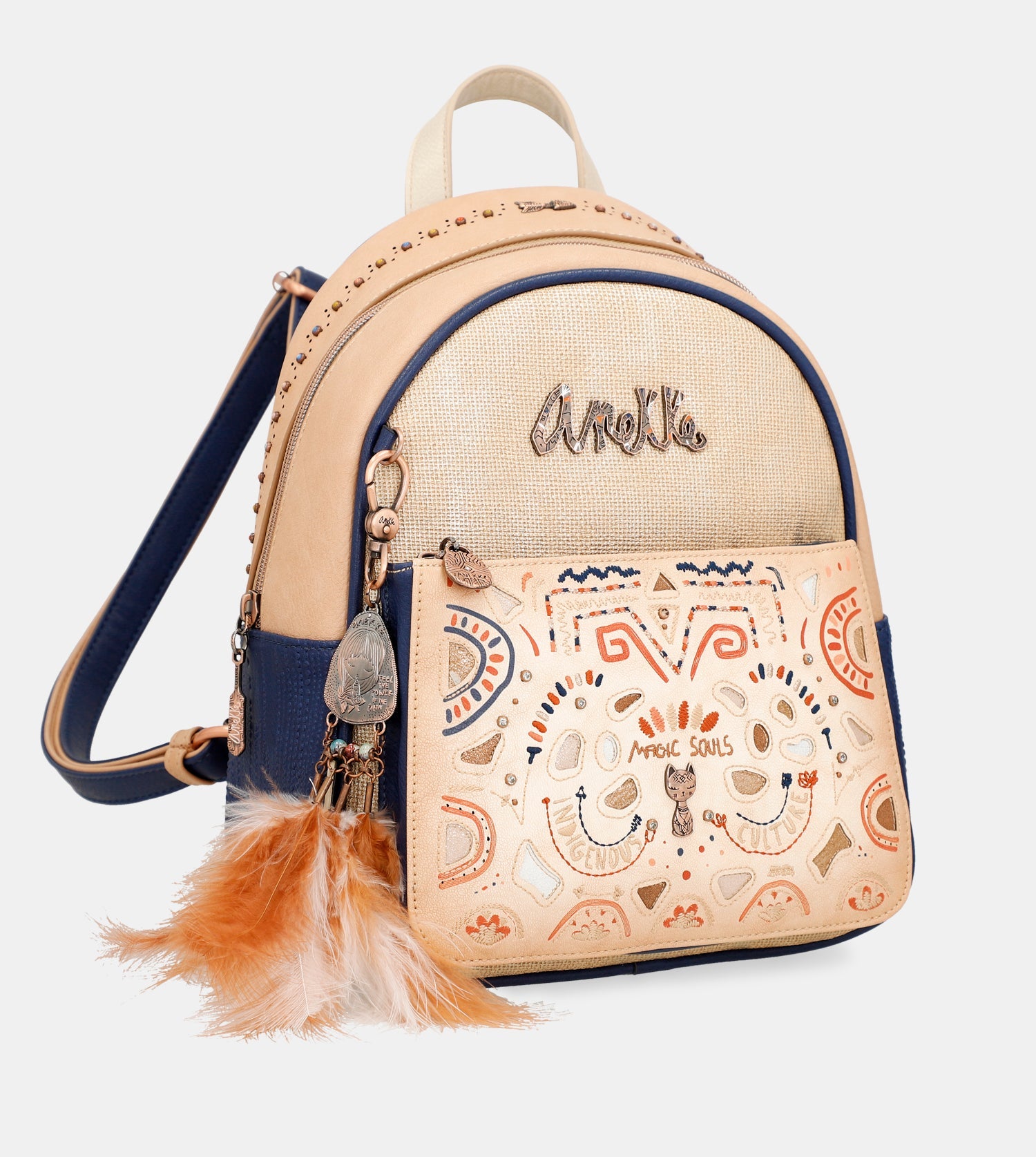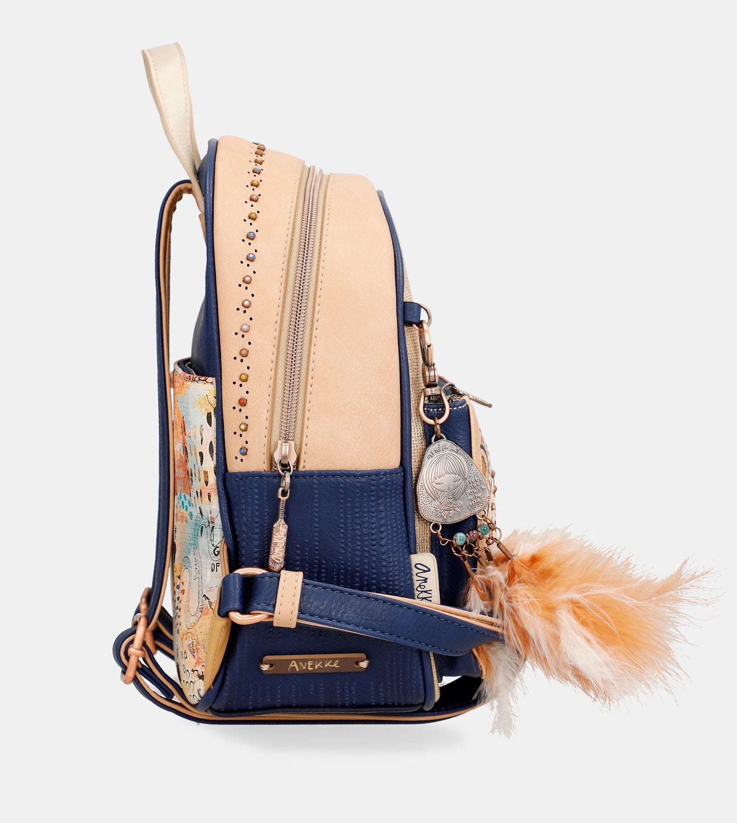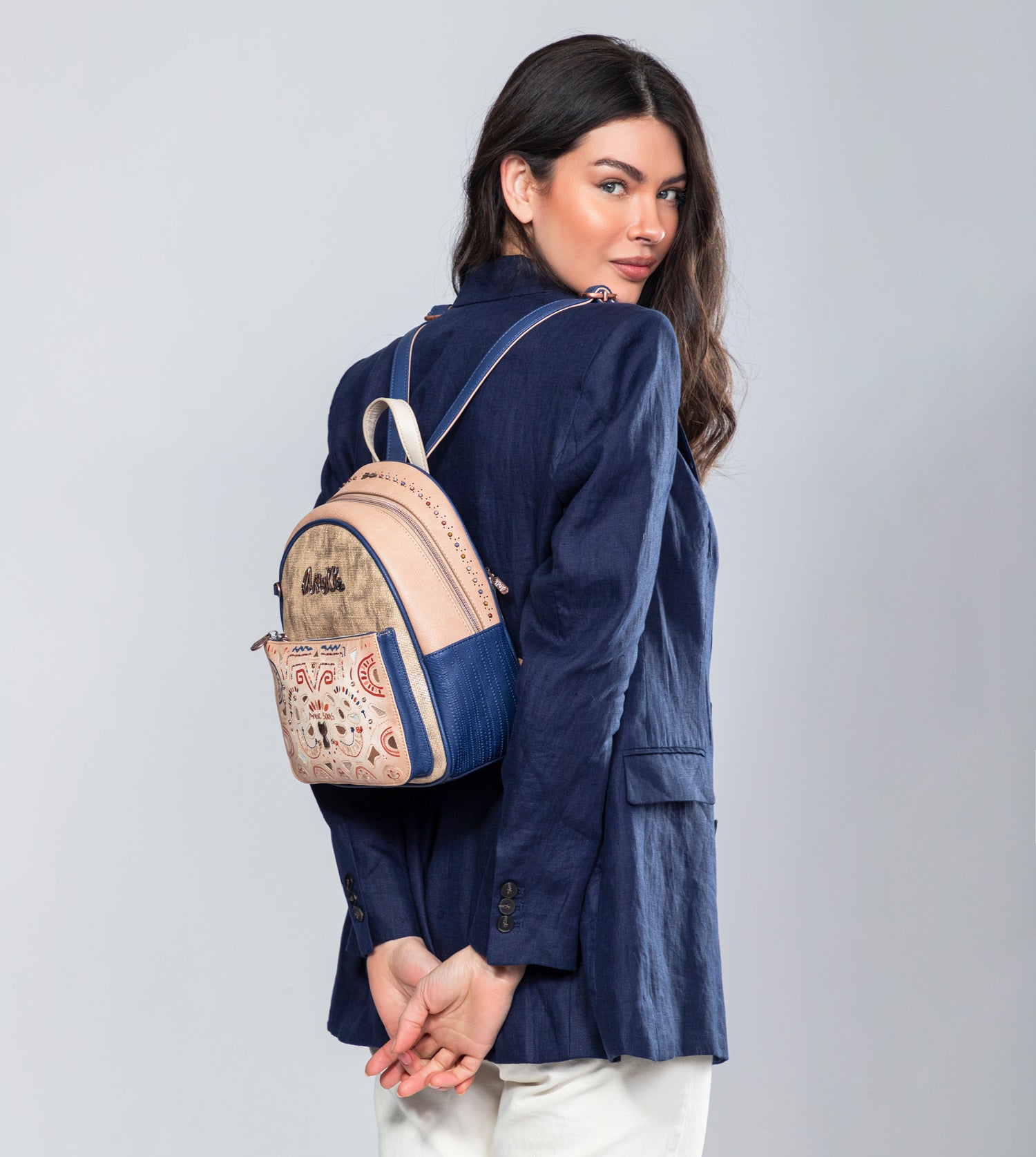 Praktický batoh s motívom kolekcie Menire - Tribe. Na vonkajšej zadnej aj prednej strane je vrecko na zips. Vo vnútri kabelky je otvorené vrecko na mobil a kľúče, taktiež vrecko so zipsom na doklady. Popruhy batohu sú nastaviteľné podľa potreby. Batoh je balený v taške Anekke.