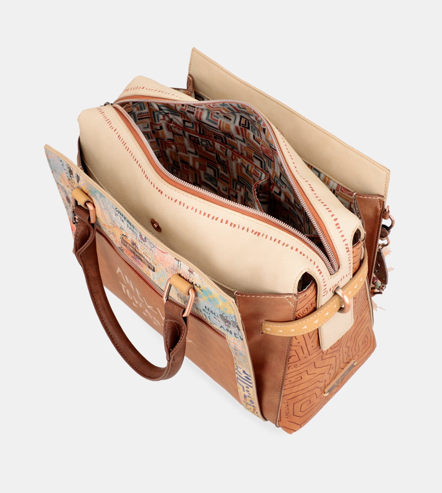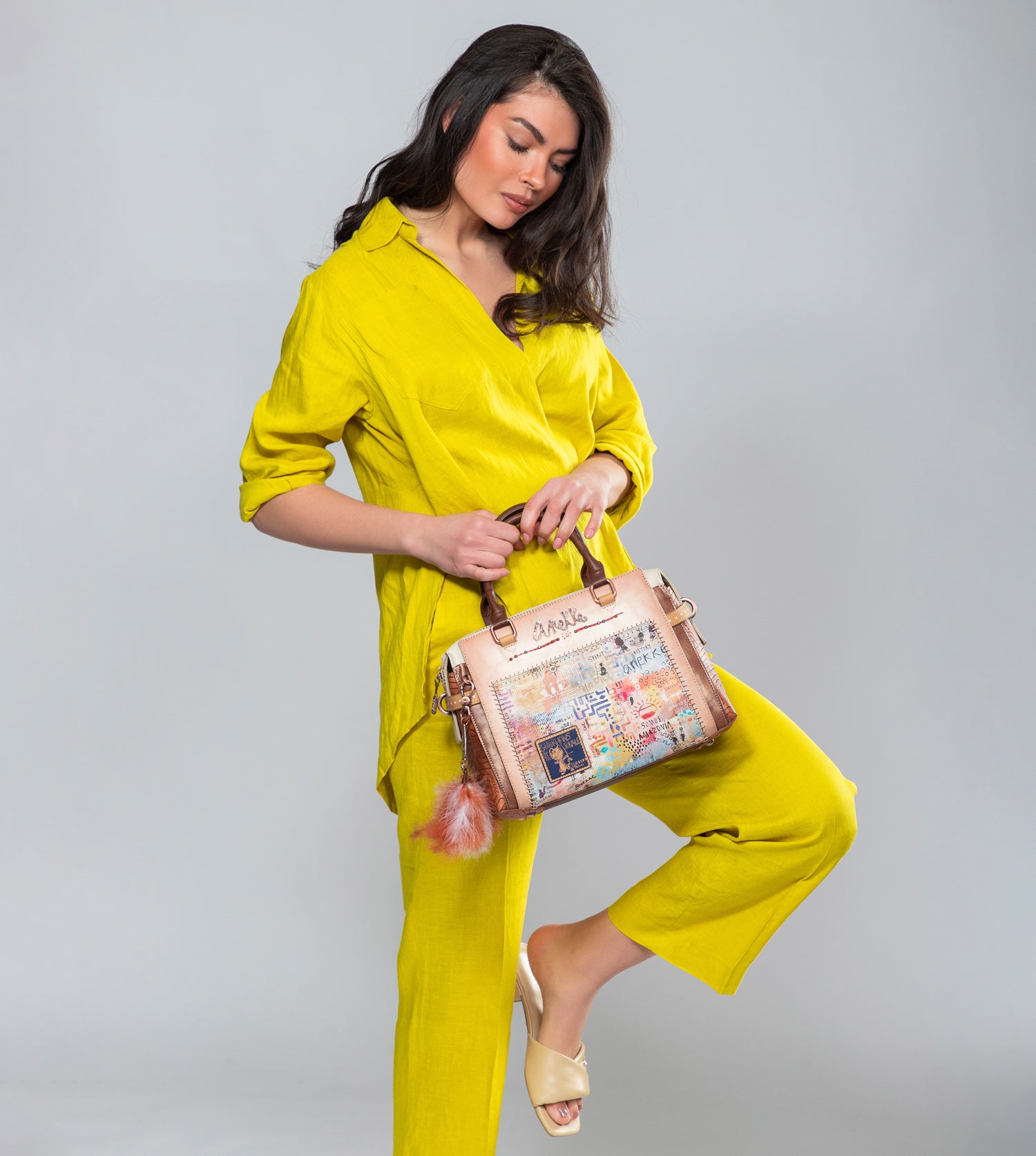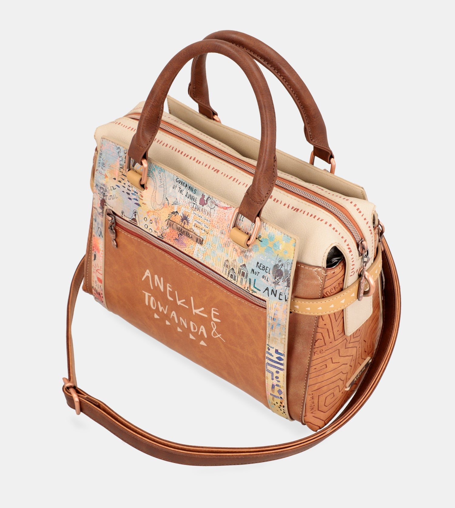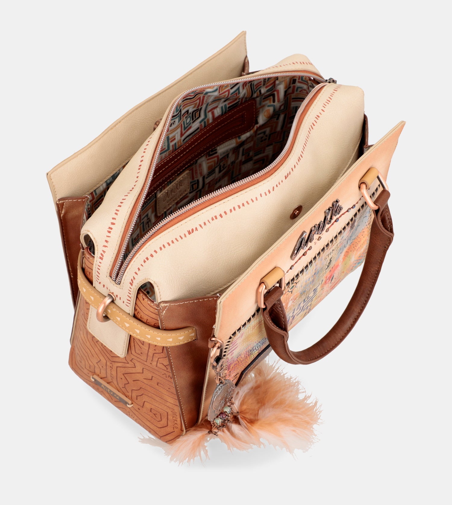 Praktická kabelka do ruky s motívom kolekcie Menire - Tribe ktorú zdobí prívesok Anekke. Na zadnej vonkajšej strane je vrecko na zips. Vo vnútri je otvorené vrecko na mobil a kľúče, taktiež vrecko na zips na doklady. Kabelka má zapínanie na zips. Súčasťou balenia je aj popruh ktorý je nastaviteľný podľa potreby. Kabelka je balená v taške Anekke.