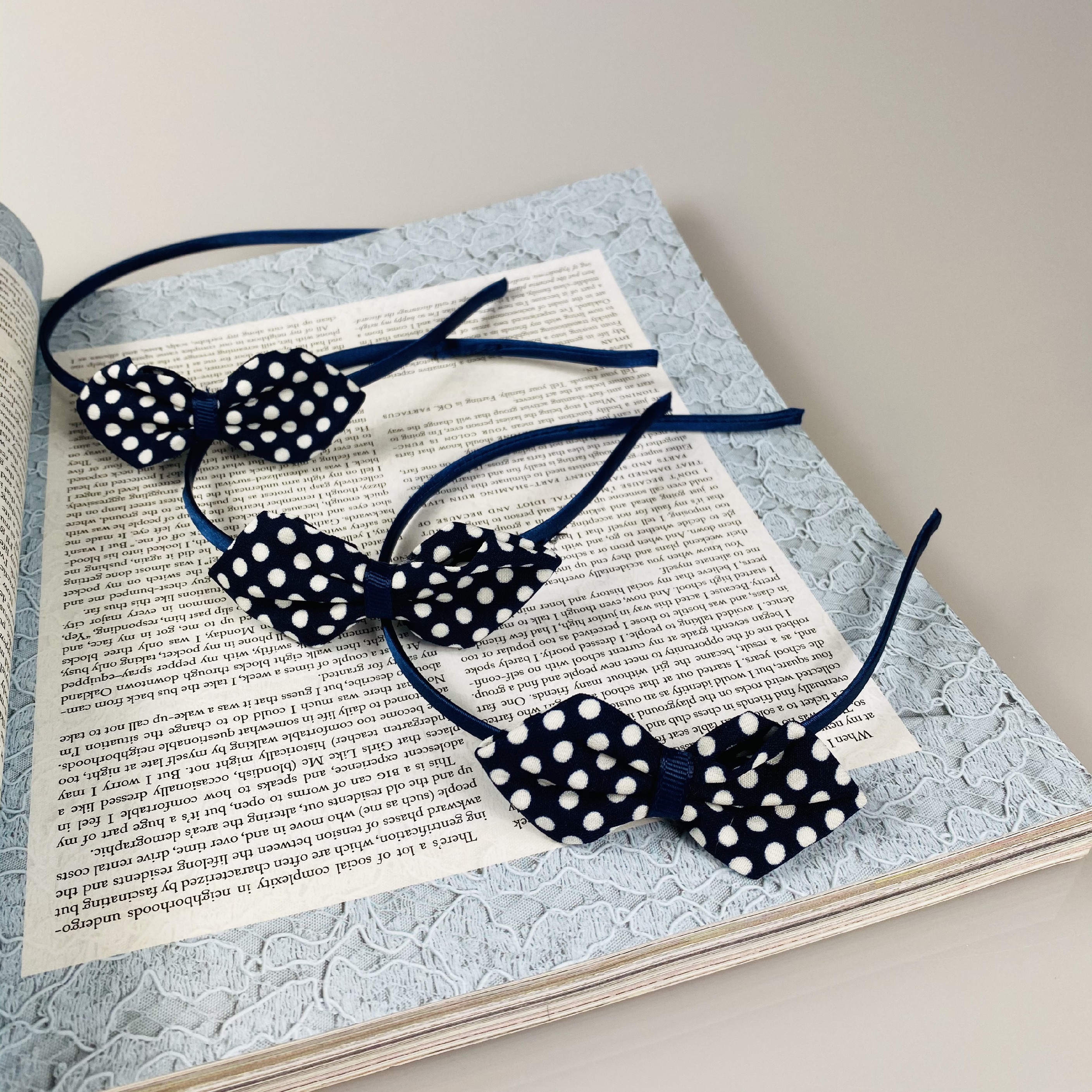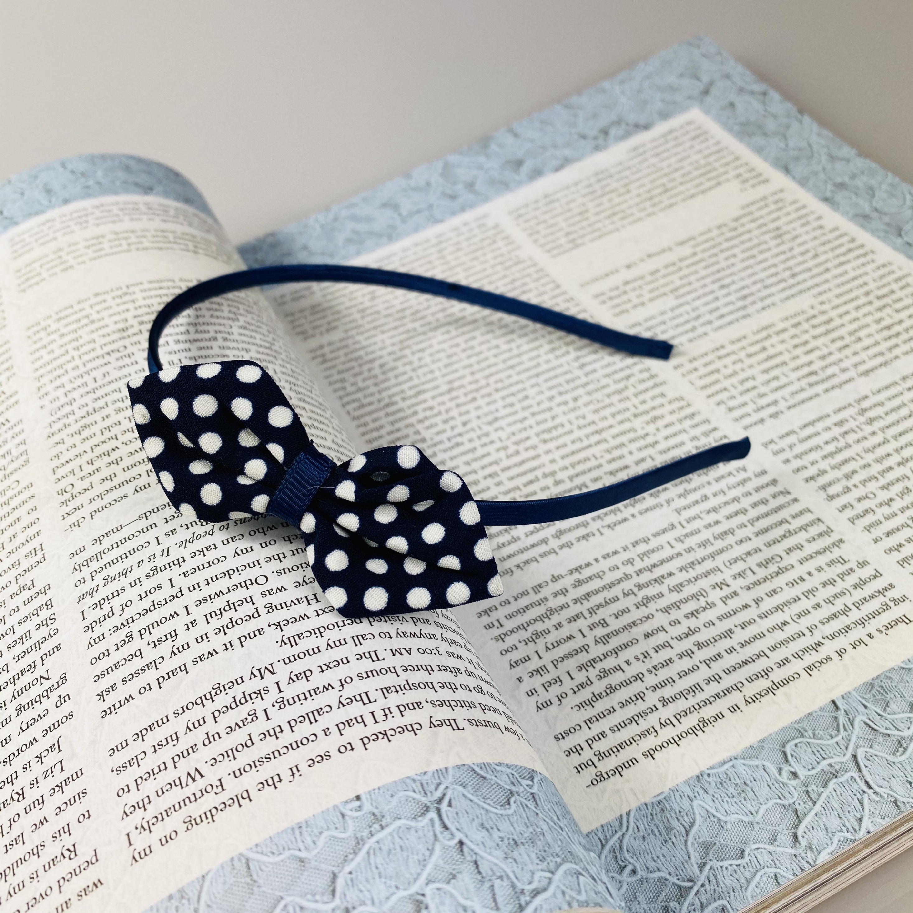 Nádherná čelenka s bodkovanou mašľou v modrej farbe.