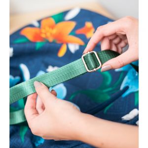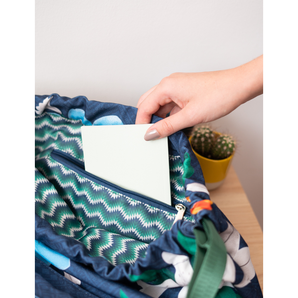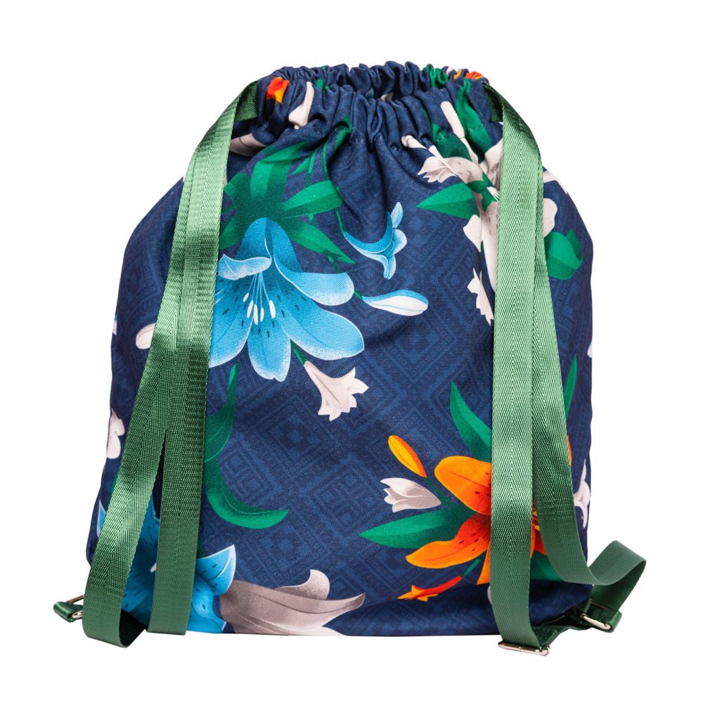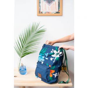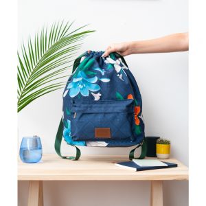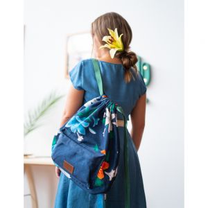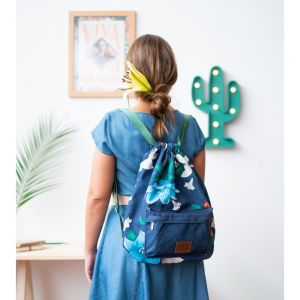 Štýlový batoh v modrej farbe s motívom Frida Kahlo. Popruhy sú nastaviteľné podľa potreby.