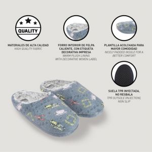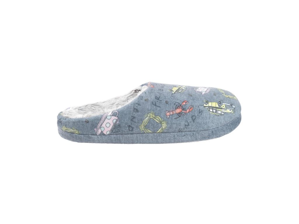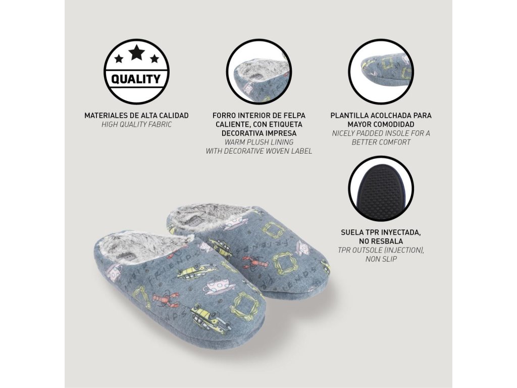 Teplé papuče v sivej farbe s motívom obľúbeného seriálu Friends. Papuče majú spevnenú spodnú časť.