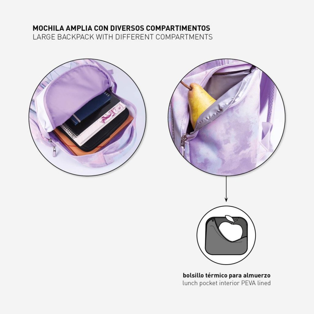 Po oboch stranách tašky sa nachádzajú bočné vrecko na fľašu s vodou a termo vrecko. Taška má uzatváranie na zips. Hlavný priestor má jednu časť. Menšie predné vrecko je vhodné na uloženie drobností. Do väčšej časti sa zmestia potrebné učebnice a zošity. Vystužené ramenné popruhy sa dajú nastaviť podľa potreby. Zadná časť tašky má ergonomicky tvarovanú chrbtovú časť s mäkkým polstrovaním. Vhodná pre 1.- 2. ročník základnej školy.