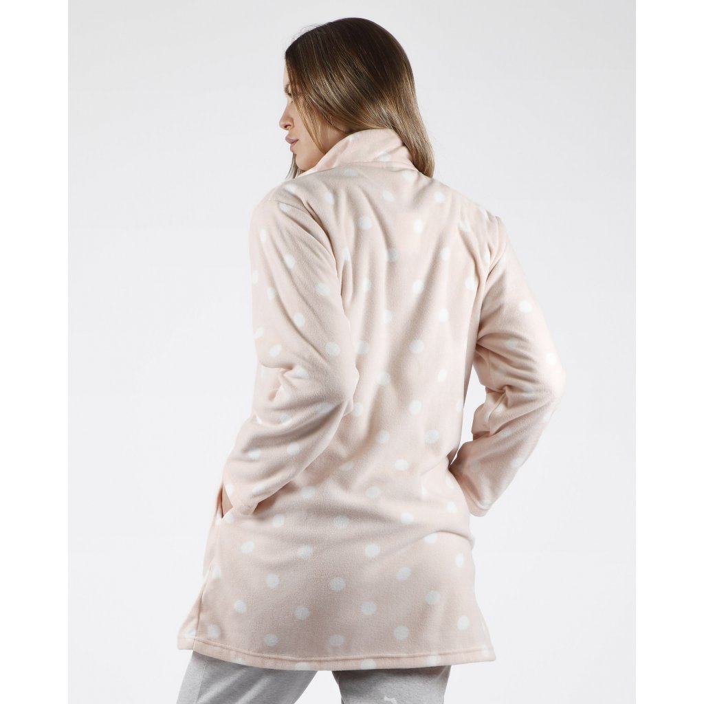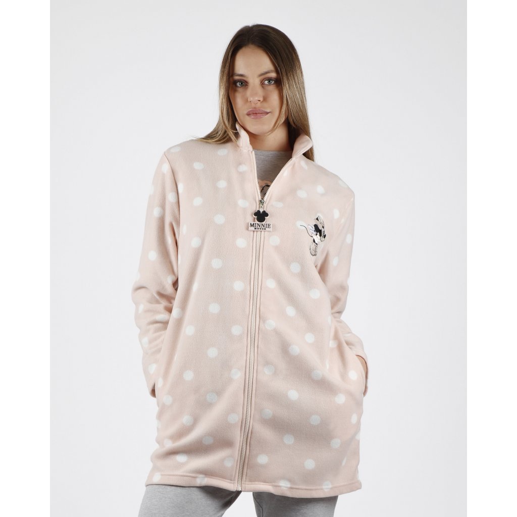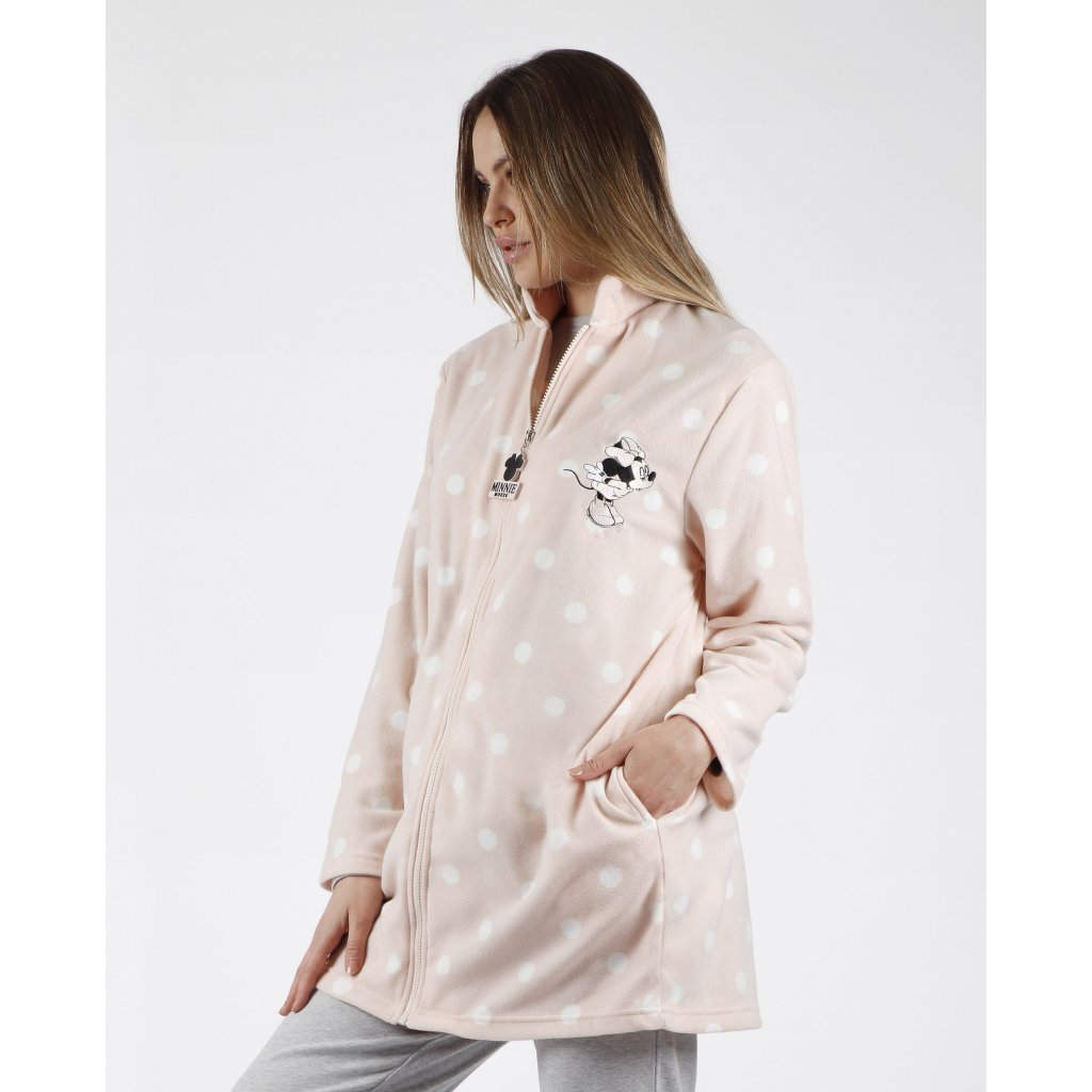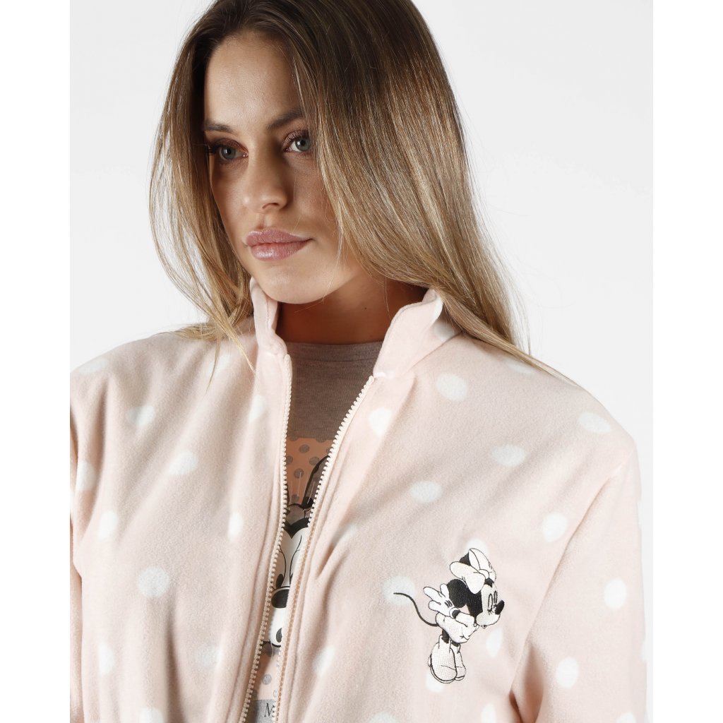 Dámsky župan s motívom Minnie. Župan má dve vrecká a zapínanie je na zips, nemá kapucňu.