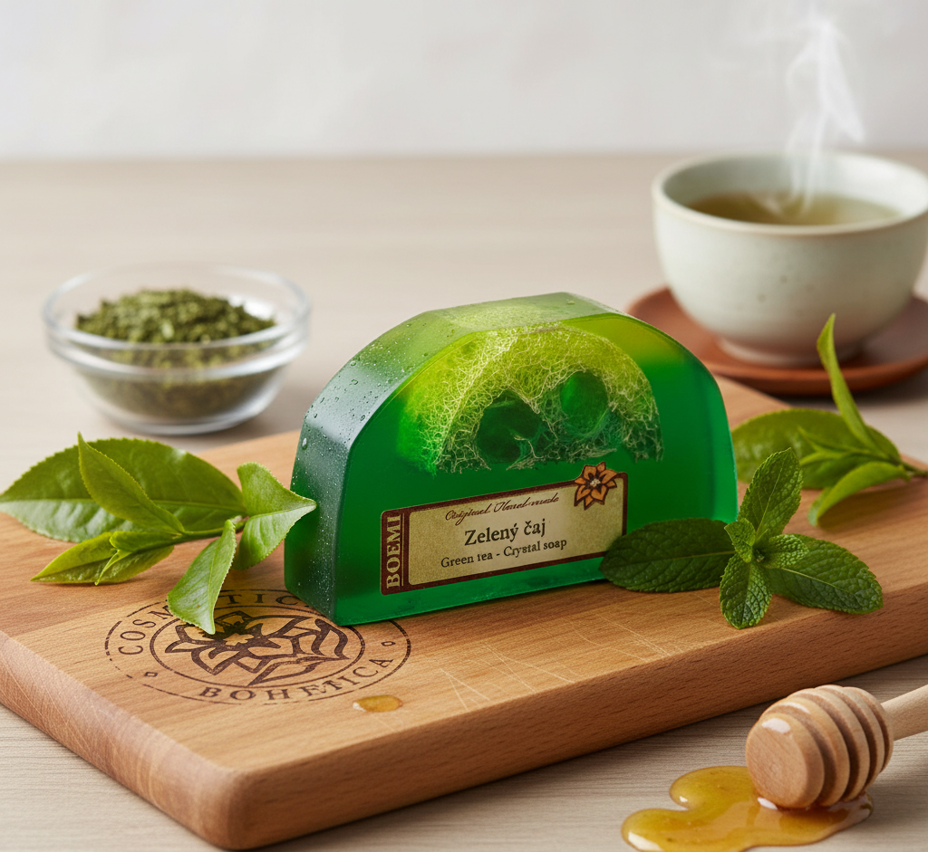 Zelený čaj je veľmi obľúbená vôňa krištáľového mydla. A čo je vlastne lufa zaliata v mydle ? Nie je to žiadna hubka, neraste to ani vo vode, ale je to vnútro dužnatého plodu podobného uhorke, ako náhrada kefy je v mydle skvelá.