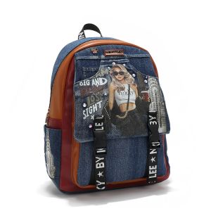 Praktický rifľový batoh americkej značky NIKKY by Nicole Lee s motívom kolekcie DREAMER. Na bočných stranách sú otvorené vrecká na drobnosti. Na prednej strane menšie vrecko na zips. Pod preklopom sa nachádza vrecko na zips na uloženie dokladov. V hlavnej priehradke je tiež vrecko na mobil, doklady a iné potrebné veci. Batoh je možné upevniť aj na rúčku od kufra pre pohodlné cestovanie.