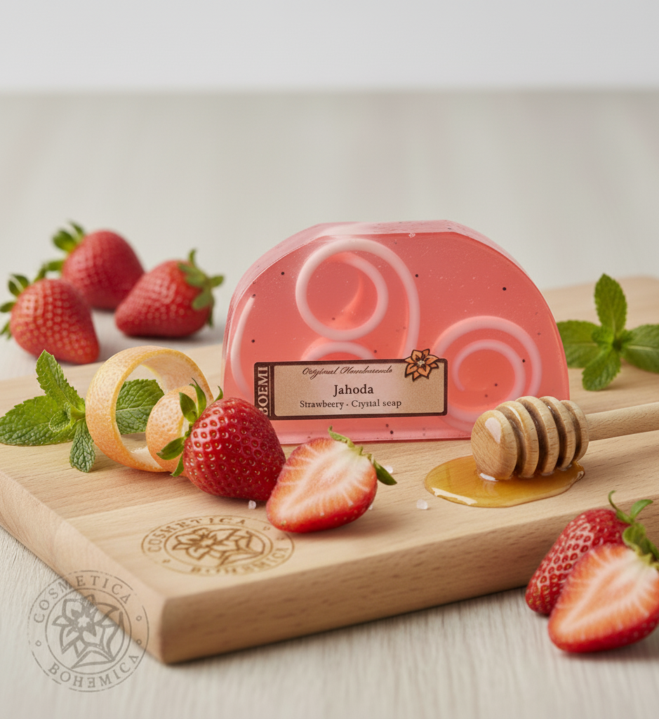 Mydlo s vôňou sladkých jahôd s makovými zrniečkami pre dôkladný peeling celého tela.