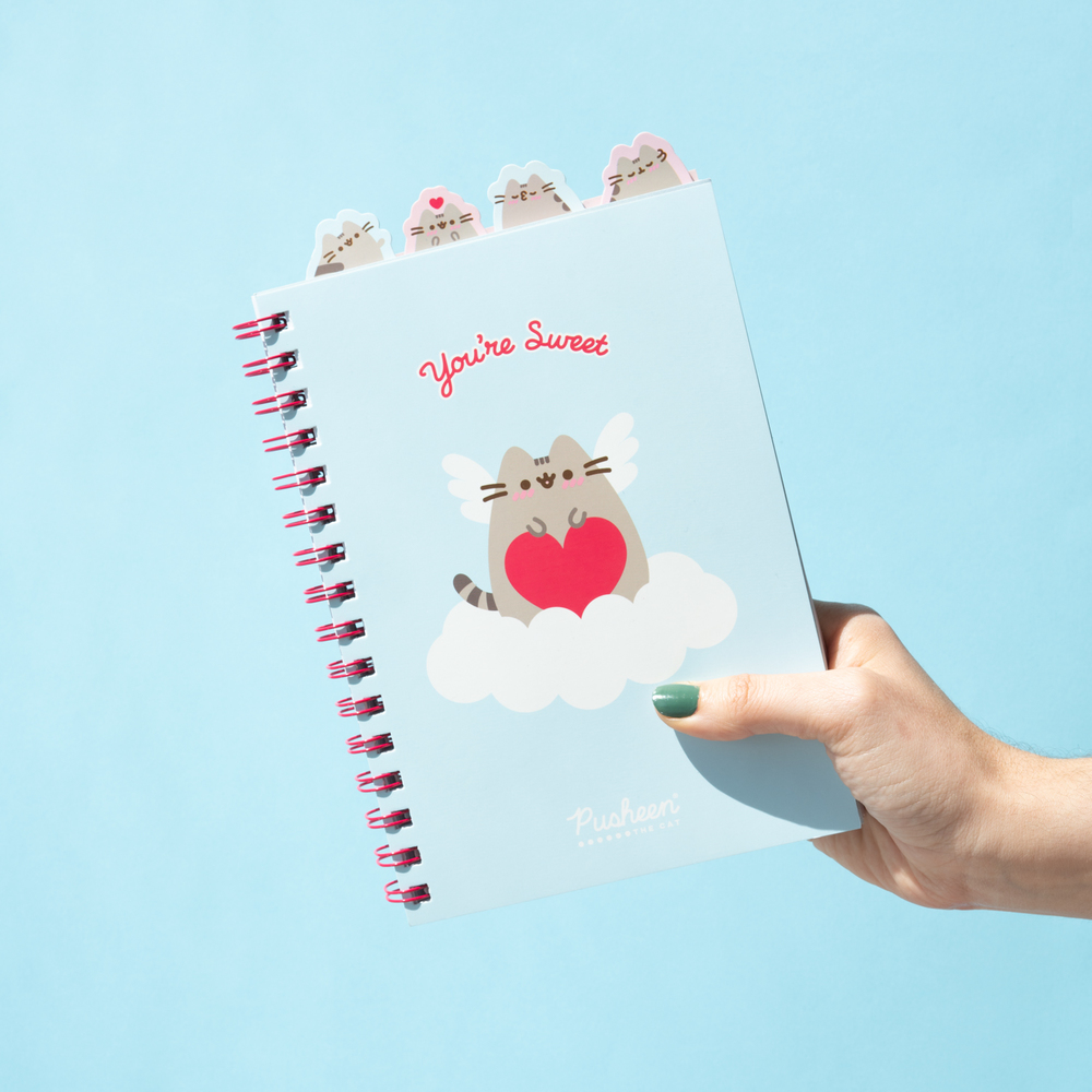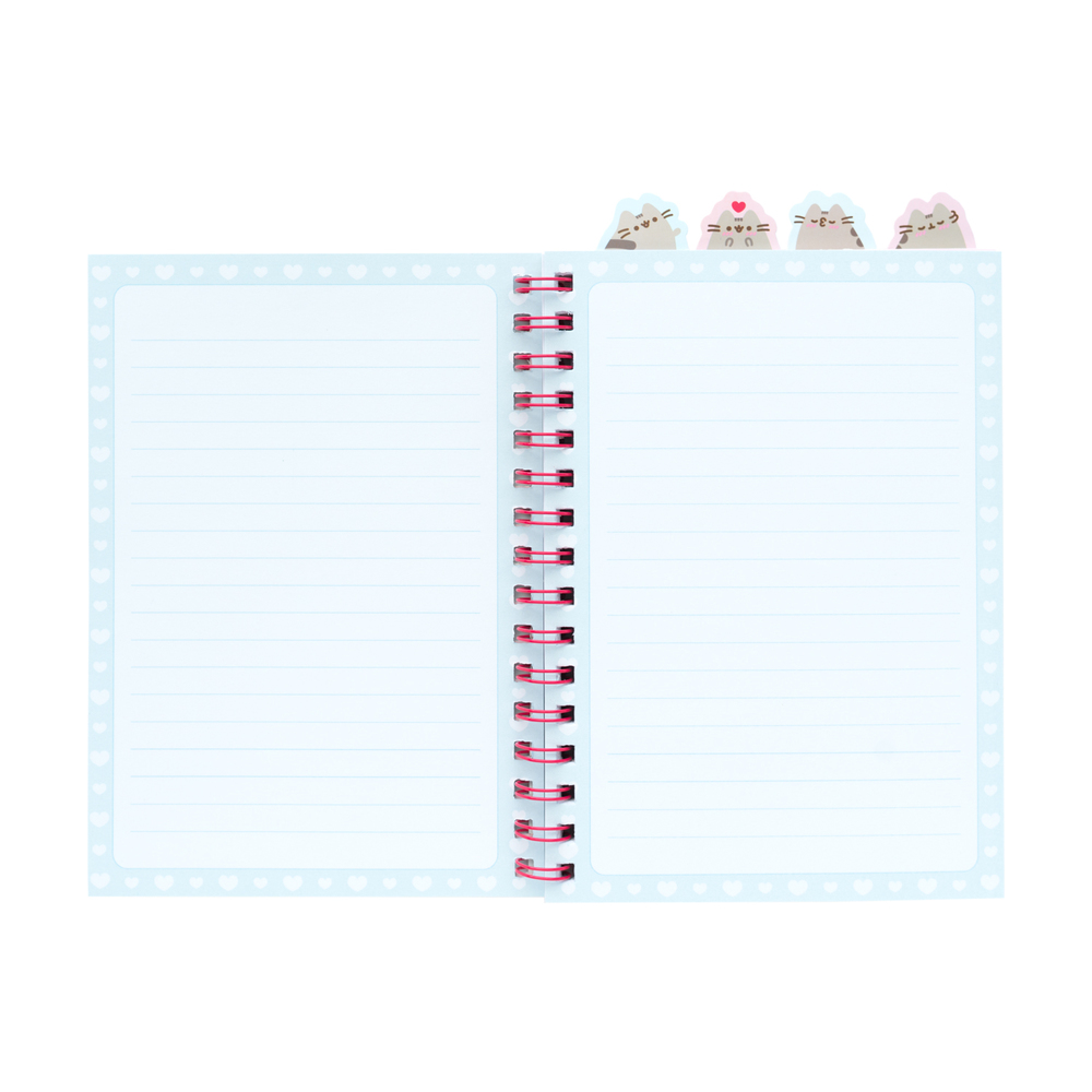 Perfektný linajkový zápisník vo veľkosti A5 so strunou s motívom obľúbenej mačky Pusheen. Uzatváranie zápisníka je na elastickú gumičku.