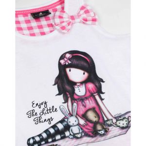 Dievčenské pyžamo s motívom Enjoy The Little Things od Santoro London. Nohavice majú v páse elastickú gumičku, vrchný diel zdobí látková mašľa a nádherná potlač - dievčatko Gorjuss. Balené v darčekovej plechovej krabičke. Materiál: 100% bavlna