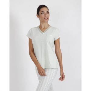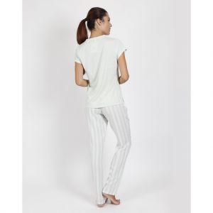 Dámske pyžamo s motívom Stripes v jemnej zelenej farbe.Vrchný diel má véčkový výstrih ktorý zdobí jemná čipka. Nohavice sú dlhé a v páse majú elastickú gumičku. Balené v darčekovej krabici.